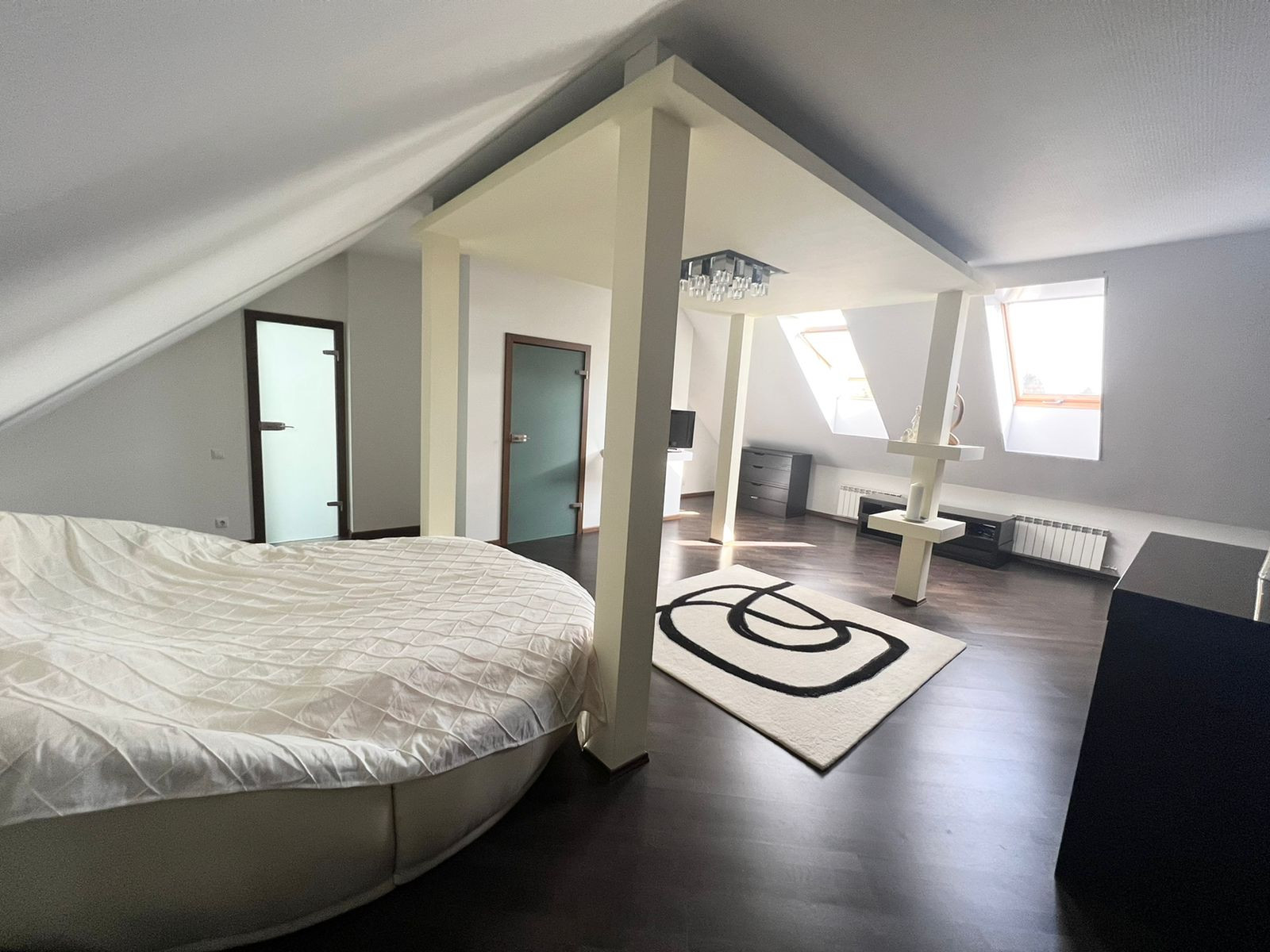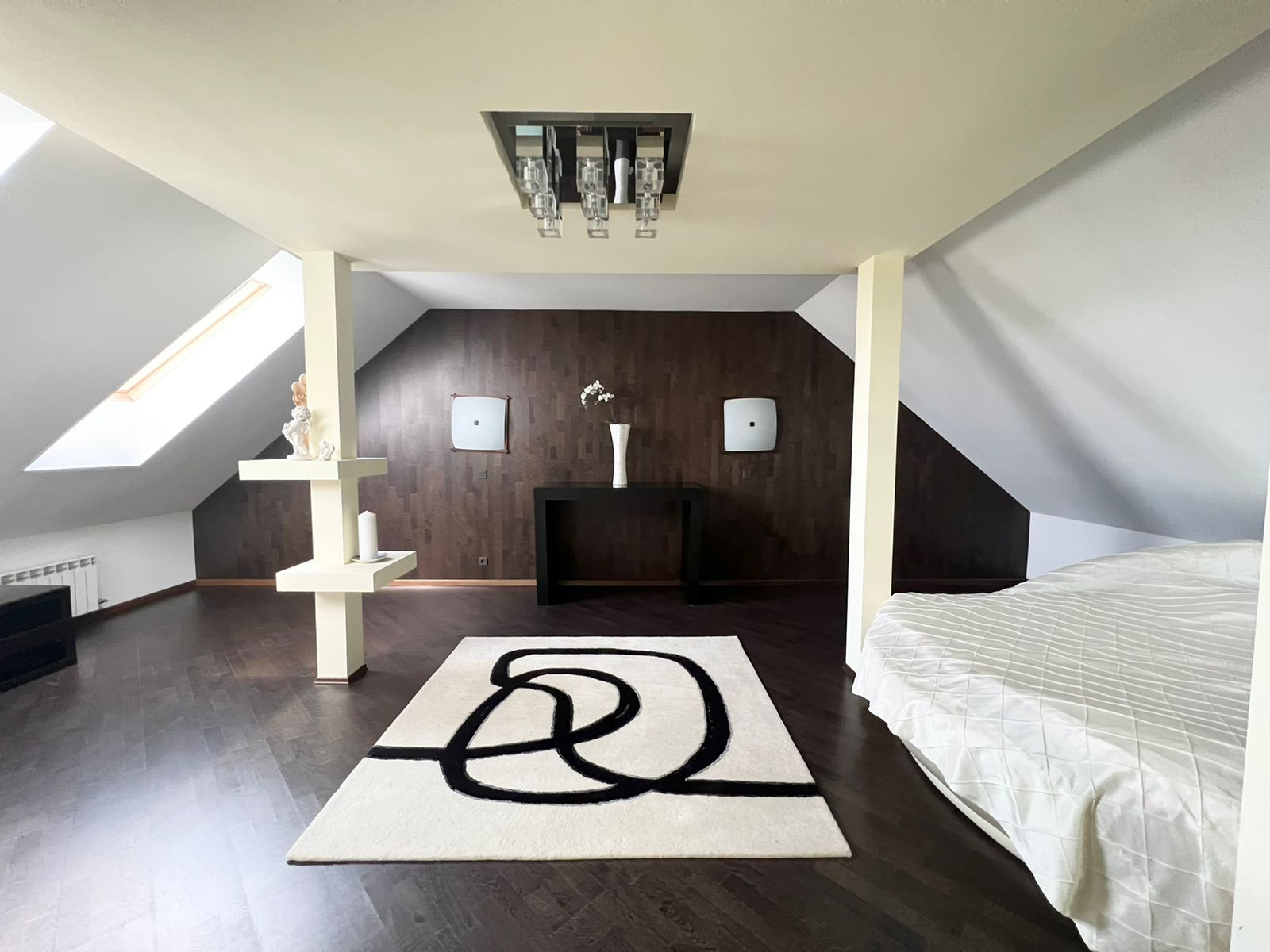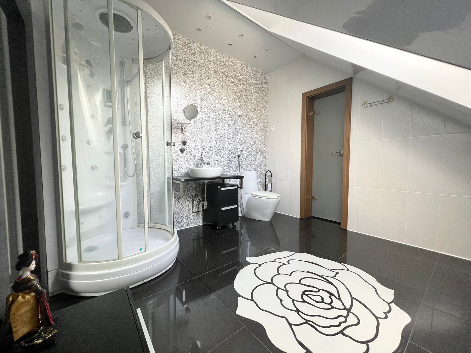 На третьем этаже спальня, ванная. А также имеется рабочий кабинет.