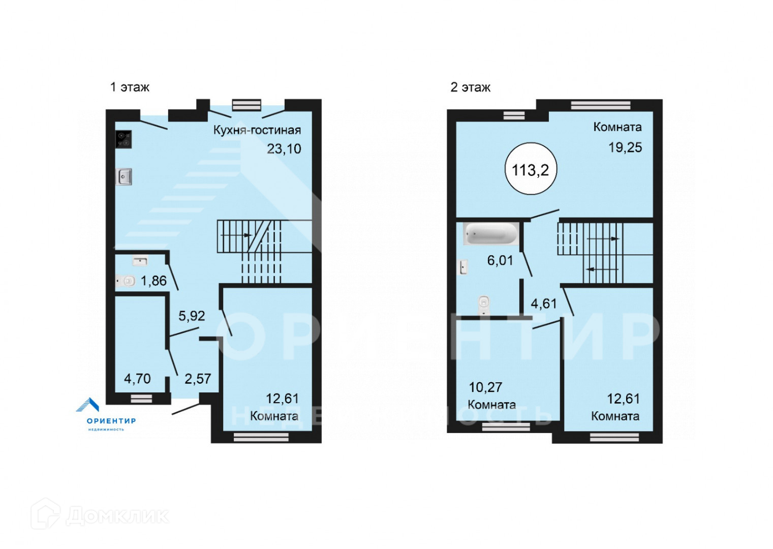 На первом этаже расположены: большая кухня-гостиная 23,1 м2 с панорамными окнами и выходом на участок, комната 12,61  м2 с местом для хранения вещей , ванная комната  и котельная . На втором этаже 3 комнаты и санузел.большая спальня 19.25 м2 спальня 10.27  м2 с распашными окнами в пол, спальня 12.61  м2, ванная комната 6.01 м2.