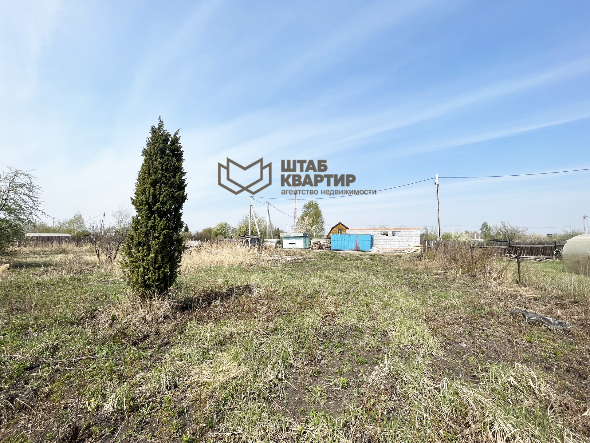 На участке выполнено подключение электричества, есть фундамент, растёт Туя