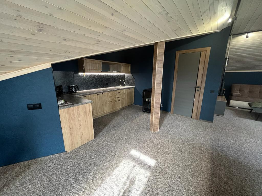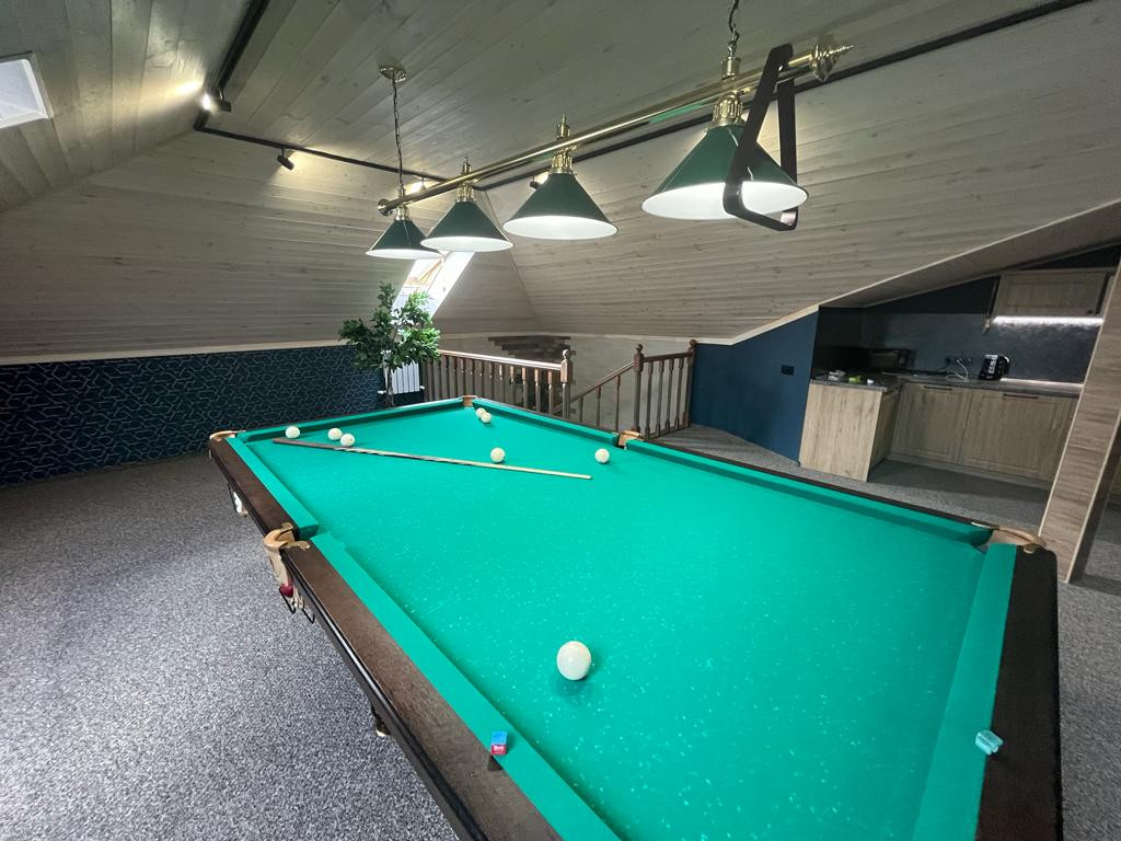 На втором этаже большая зона отдыха с бильярдом, кухня, сан узел.
