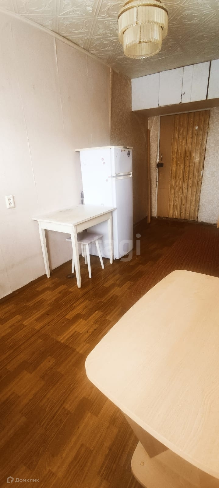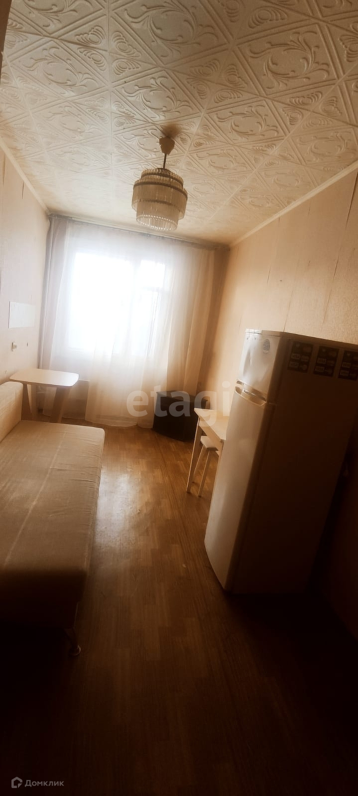 В комнате есть диван, шкаф, стол, чайник, утюг, холодильник, стиральная машина, кухонная посуда, пылесос, зеркало.