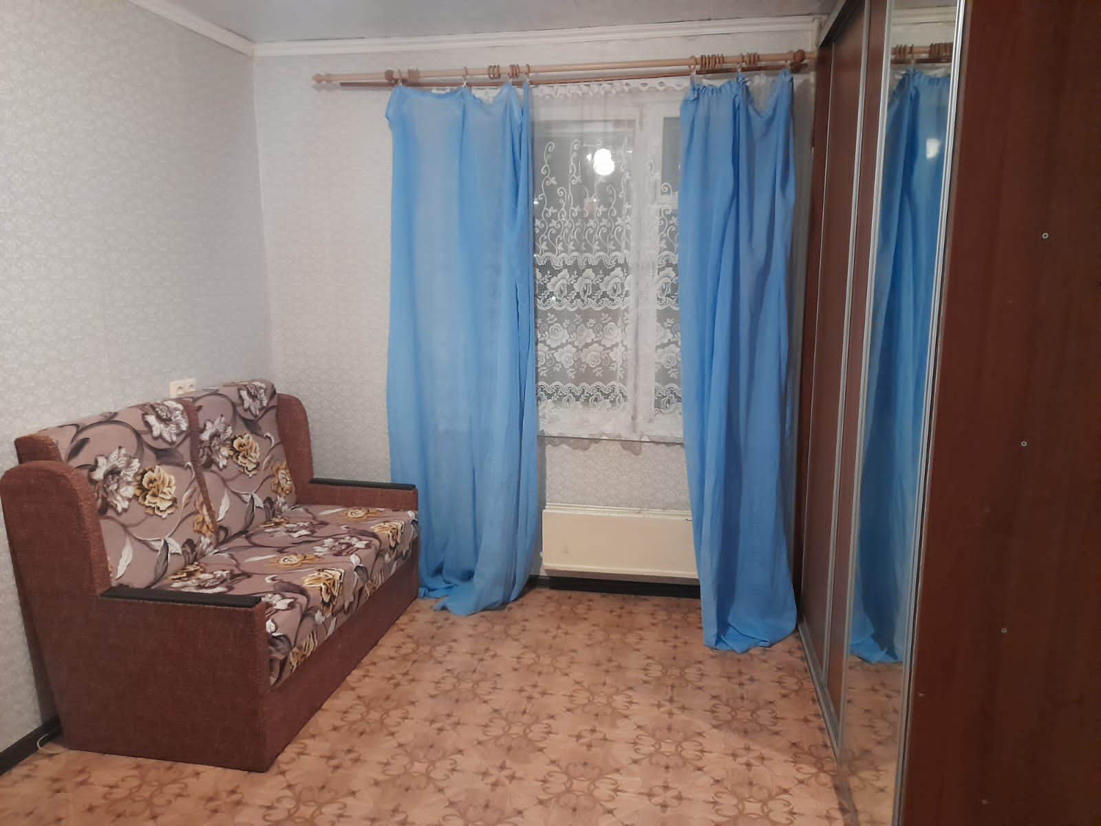 Ремонт делали год назад, все свежее и уютное. Есть диван, стол, стул, шкаф-купе, зеркало.