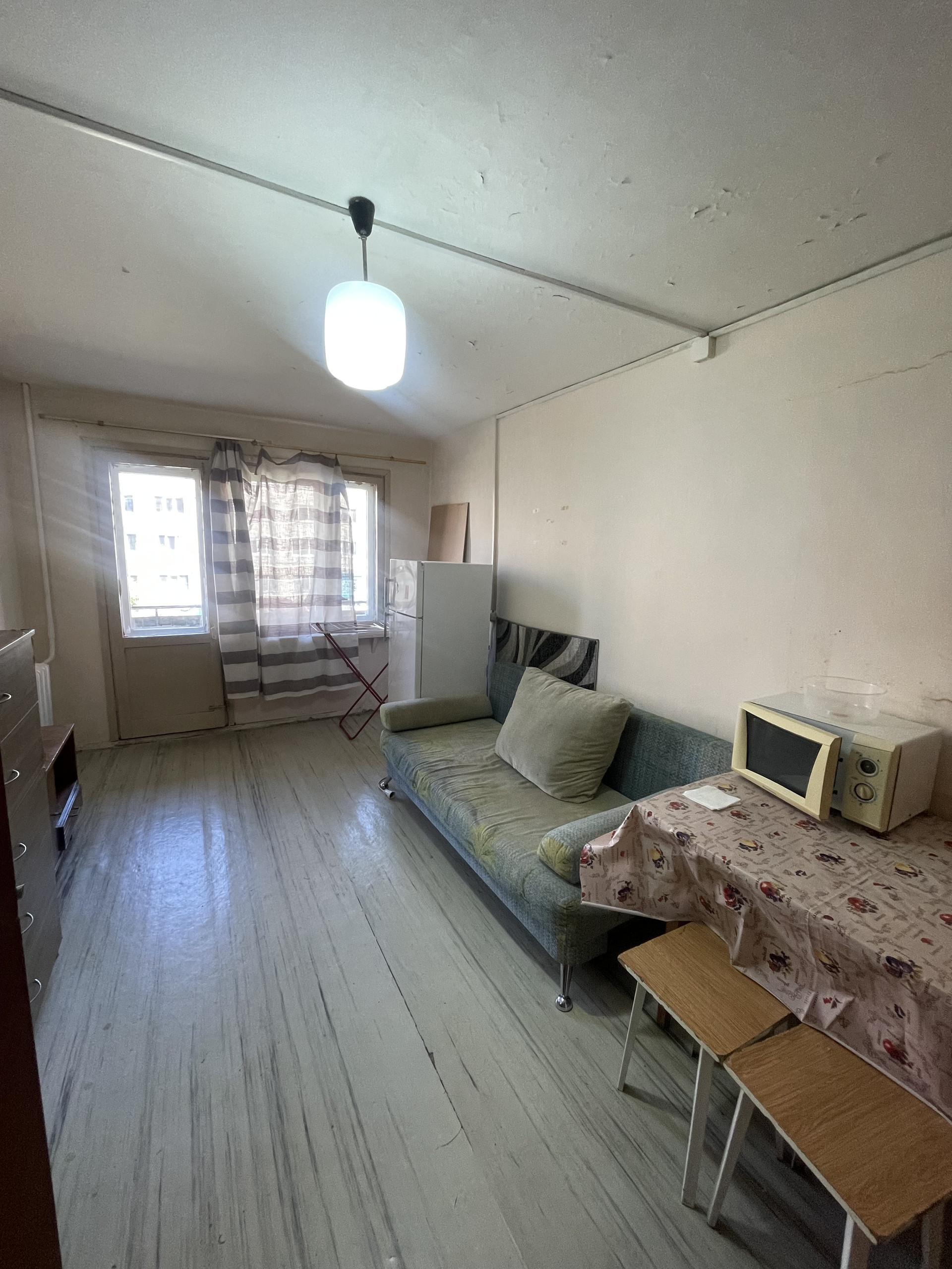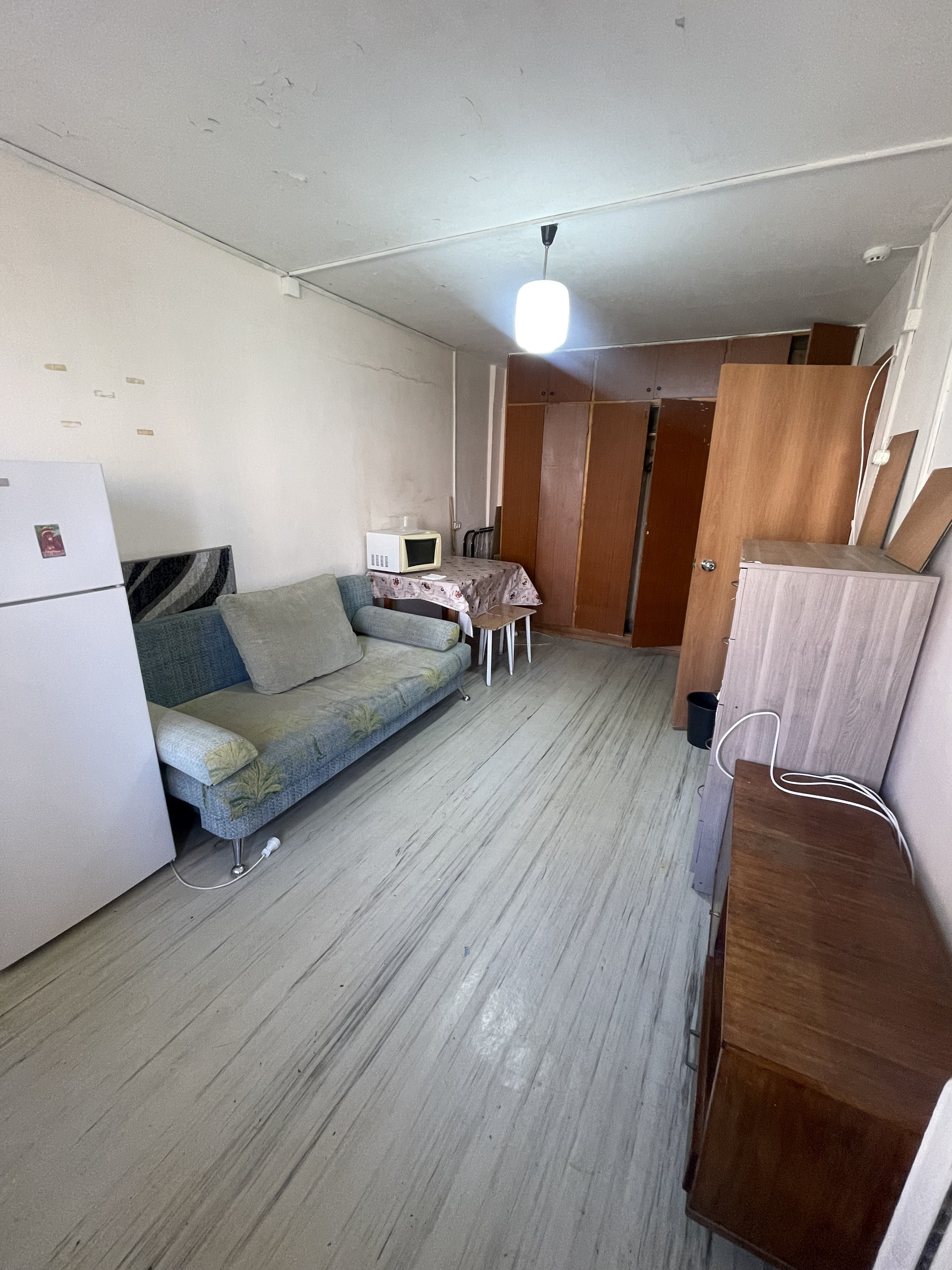 Из мебели диван, комод, холодильник, микроволновка, шкафы.