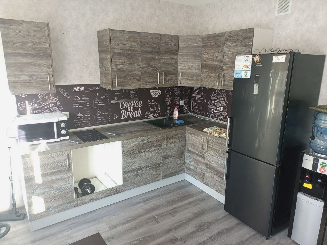 Из техники: Холодильник, плита, кулер для воды, микроволновка, стиральная машина, пылесос, кондиционер, телевизор и WiFi роутер для интернета.