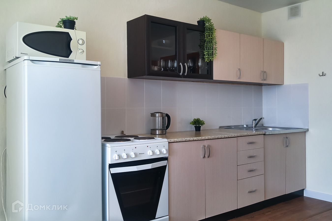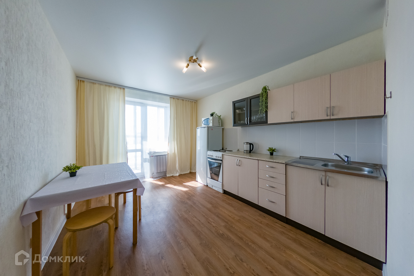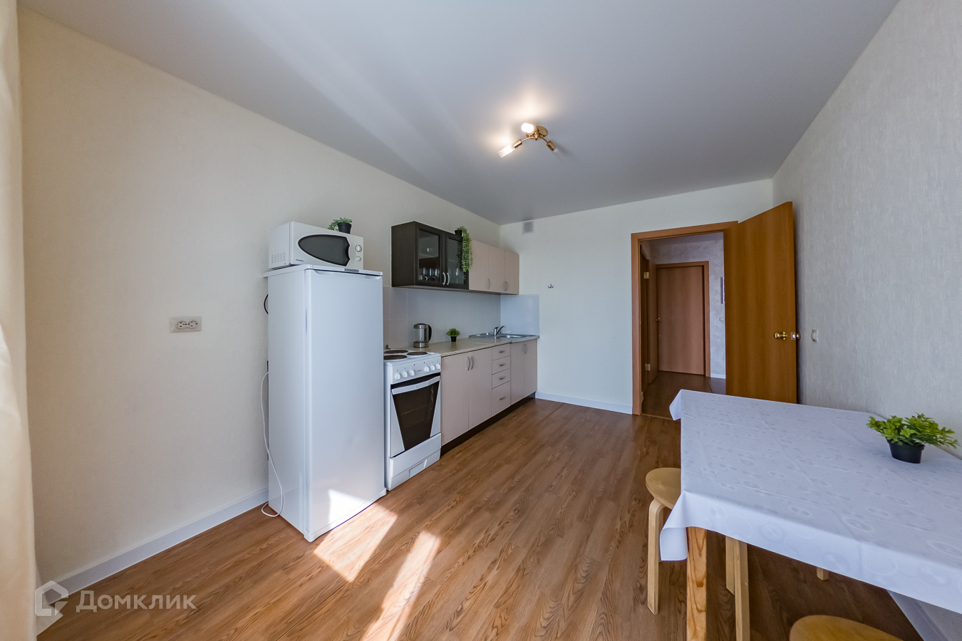 2) Кухня-гостиная оборудована техникой: электрическая плита с духовкой, холодильник, микроволновка, чайник. Компактный кухонный гарнитур. Имеется обеденный стол со стульями. Выход на небольшую лоджию.