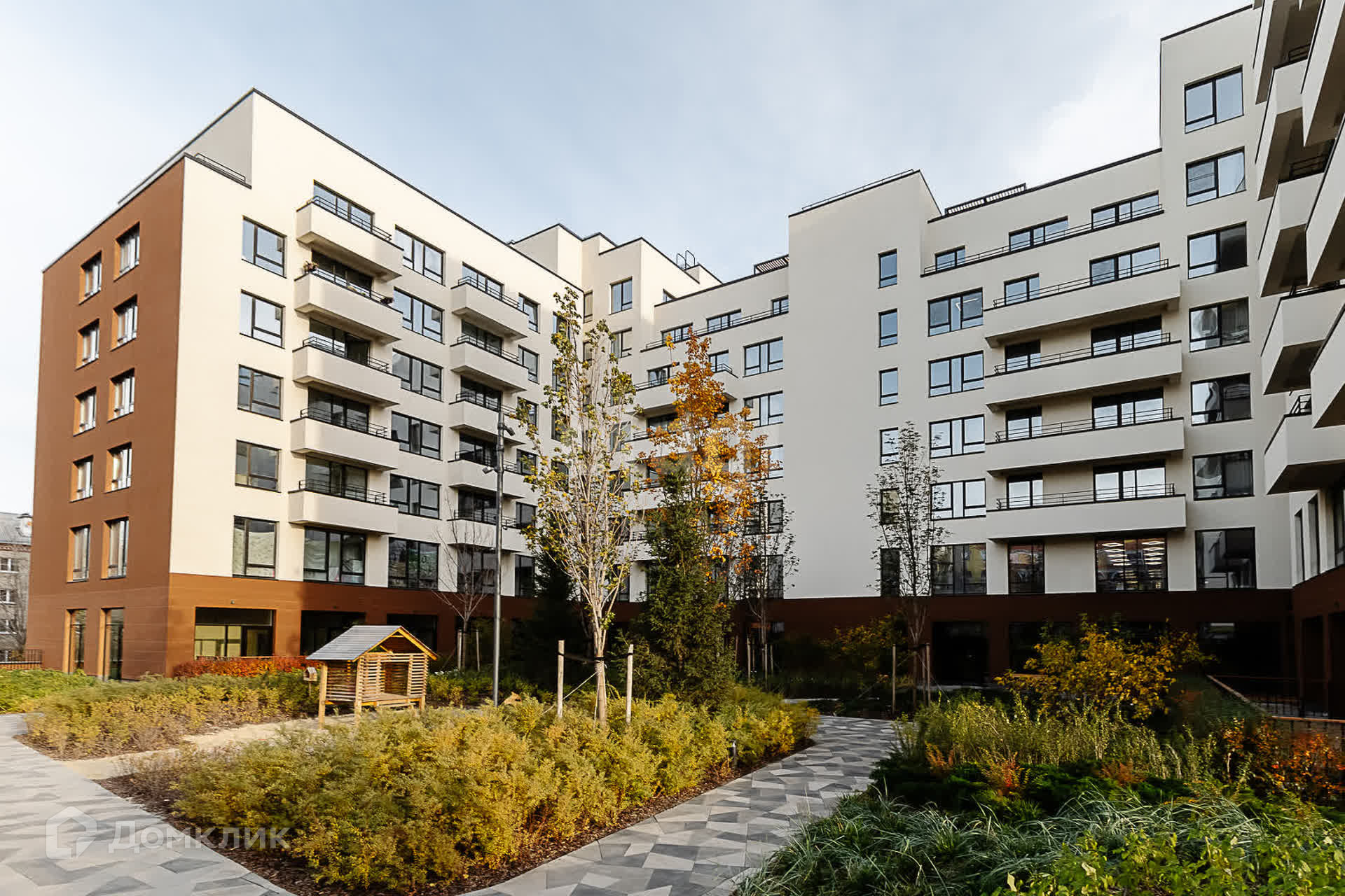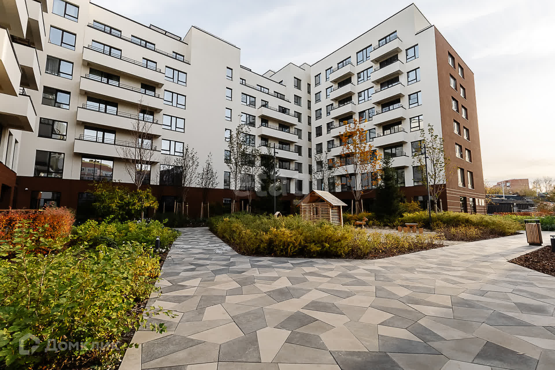 Приватный цветущий внутренний дворик с зонами отдыха как для детей, так и для взрослых.