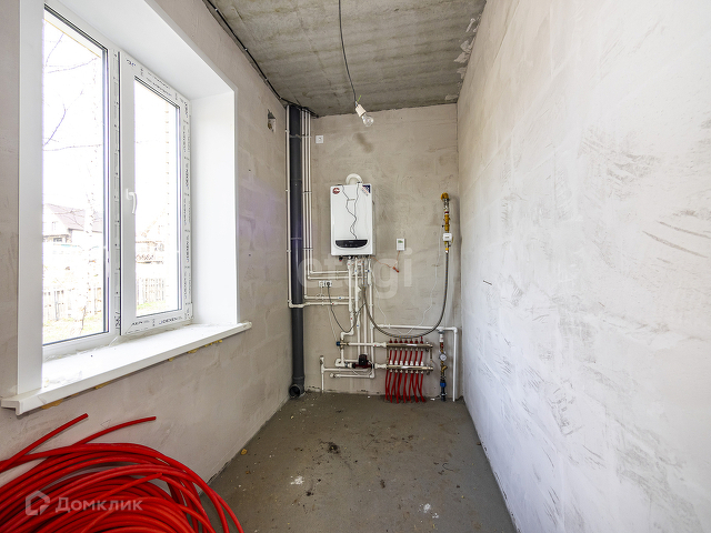 Отопление – газовый котел, первый этаж – теплый пол, второй – радиаторы. Дом готов к чистовой отделке: стены оштукатурены и зашпаклеваны, стяжка на полу, выполнена разводка электропроводки.