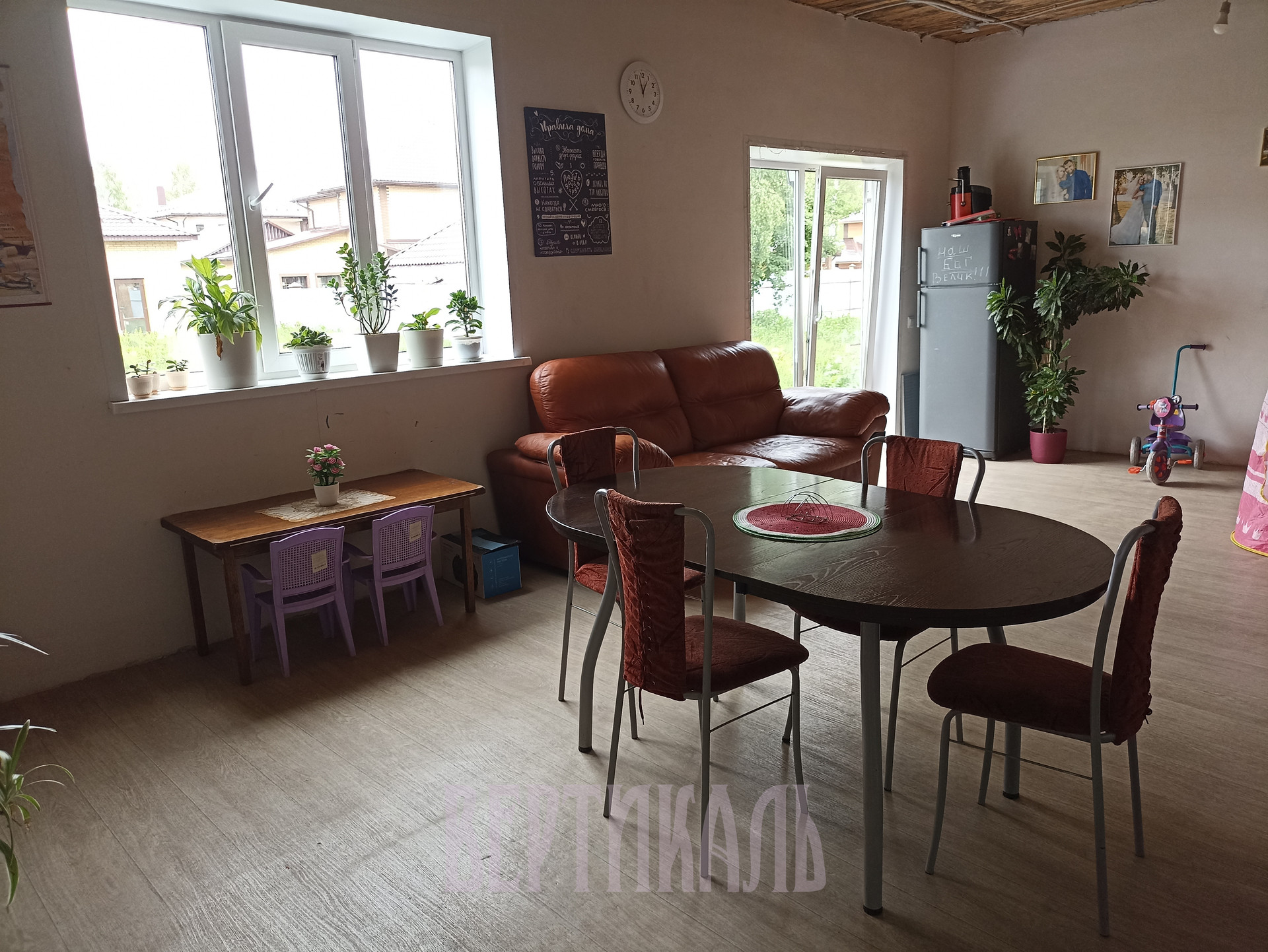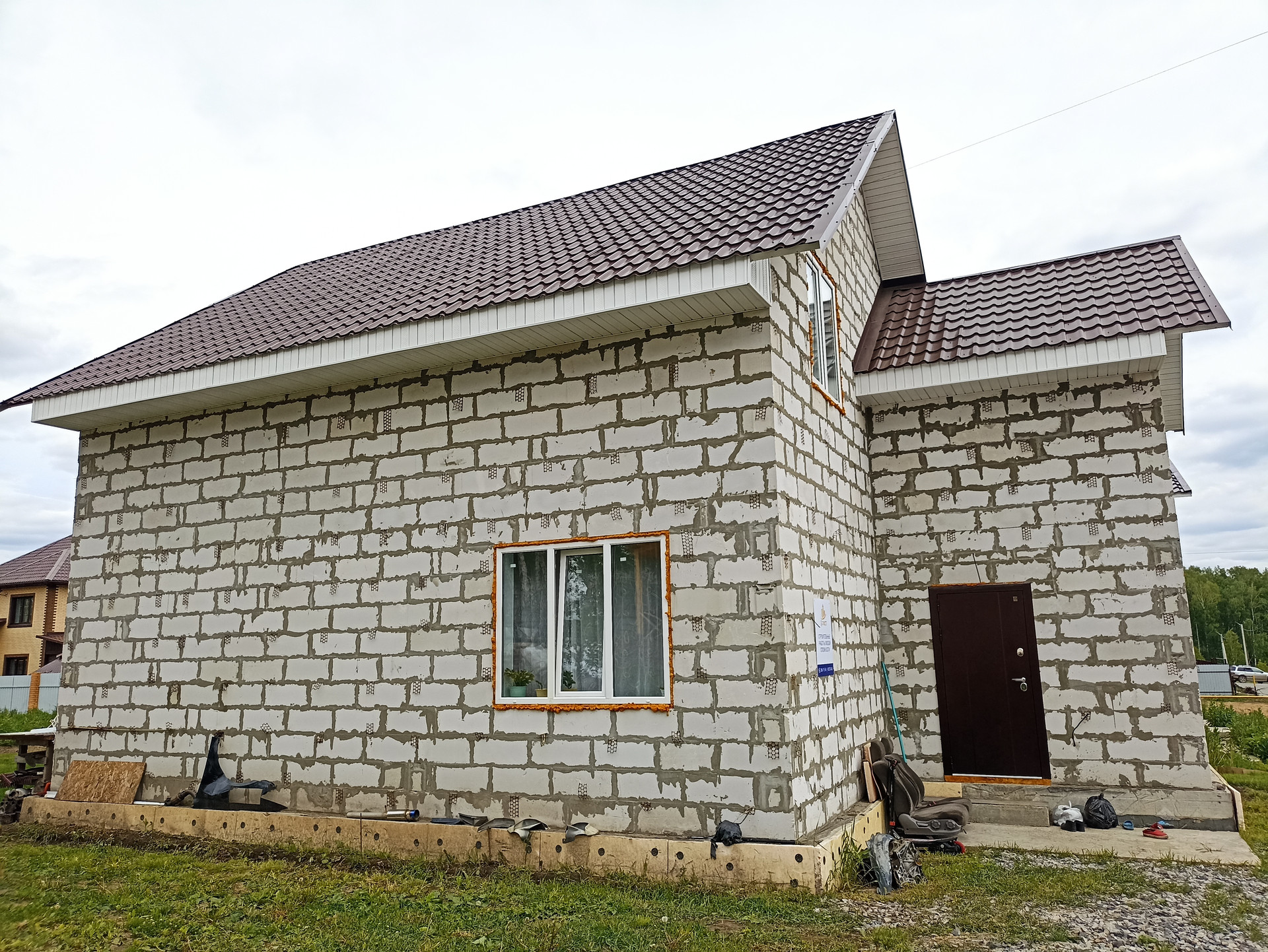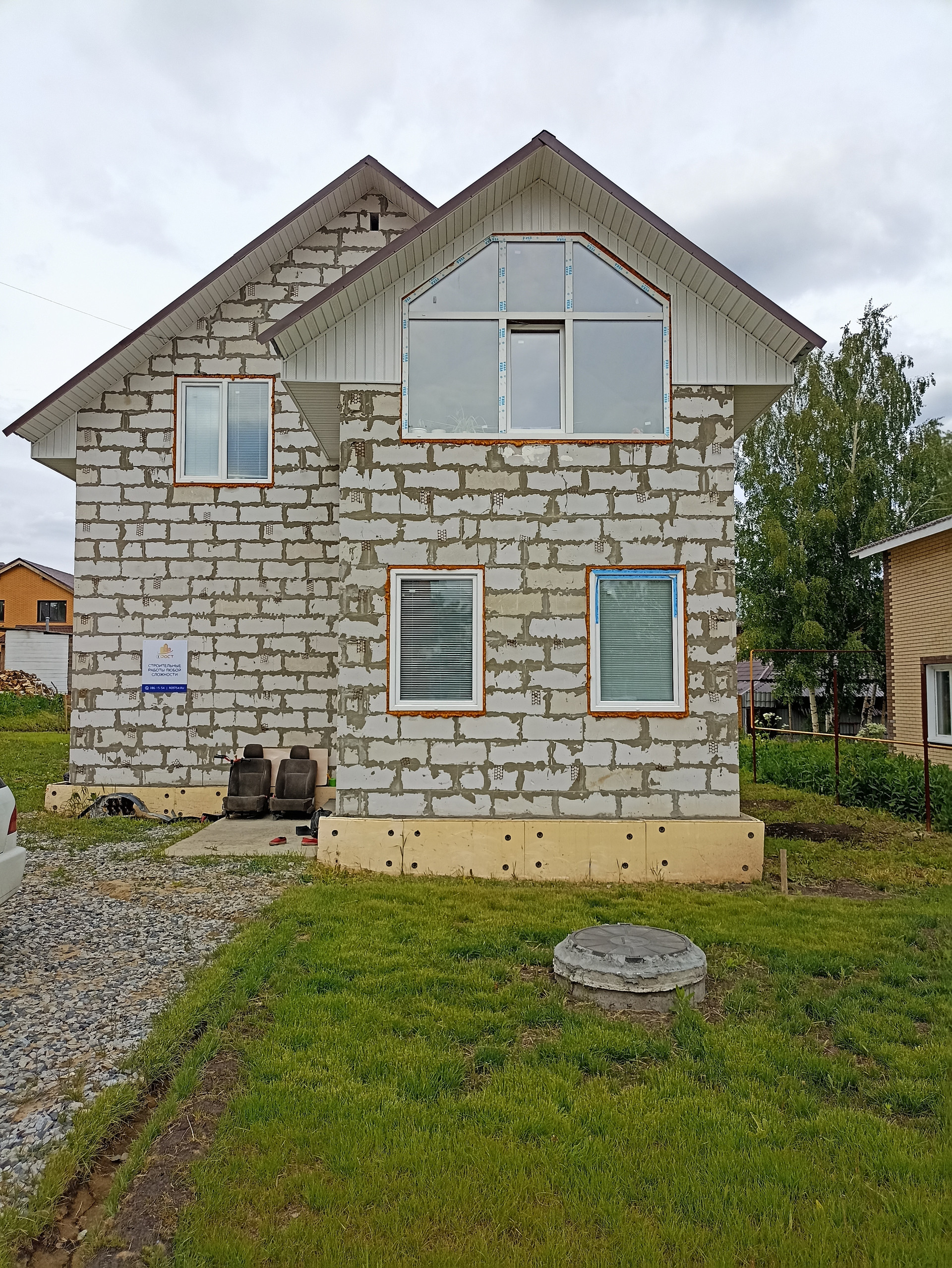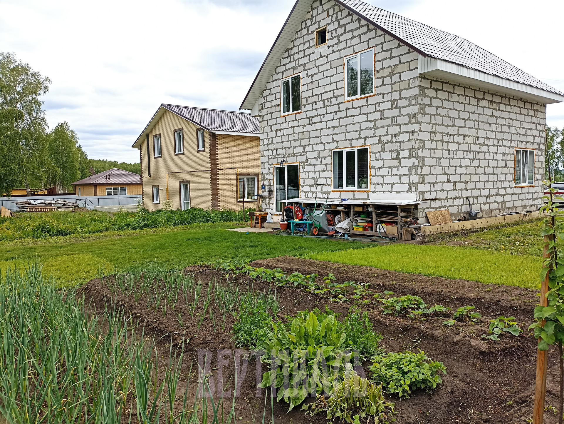Парковка возле дома засыпана камнем, на территории газон, посажены несколько плодородных деревьев, большая теплица. Безопасность, зеленая зона, чистый воздух. Год постройки: 2020. Материал стен: газосиликатный блок.