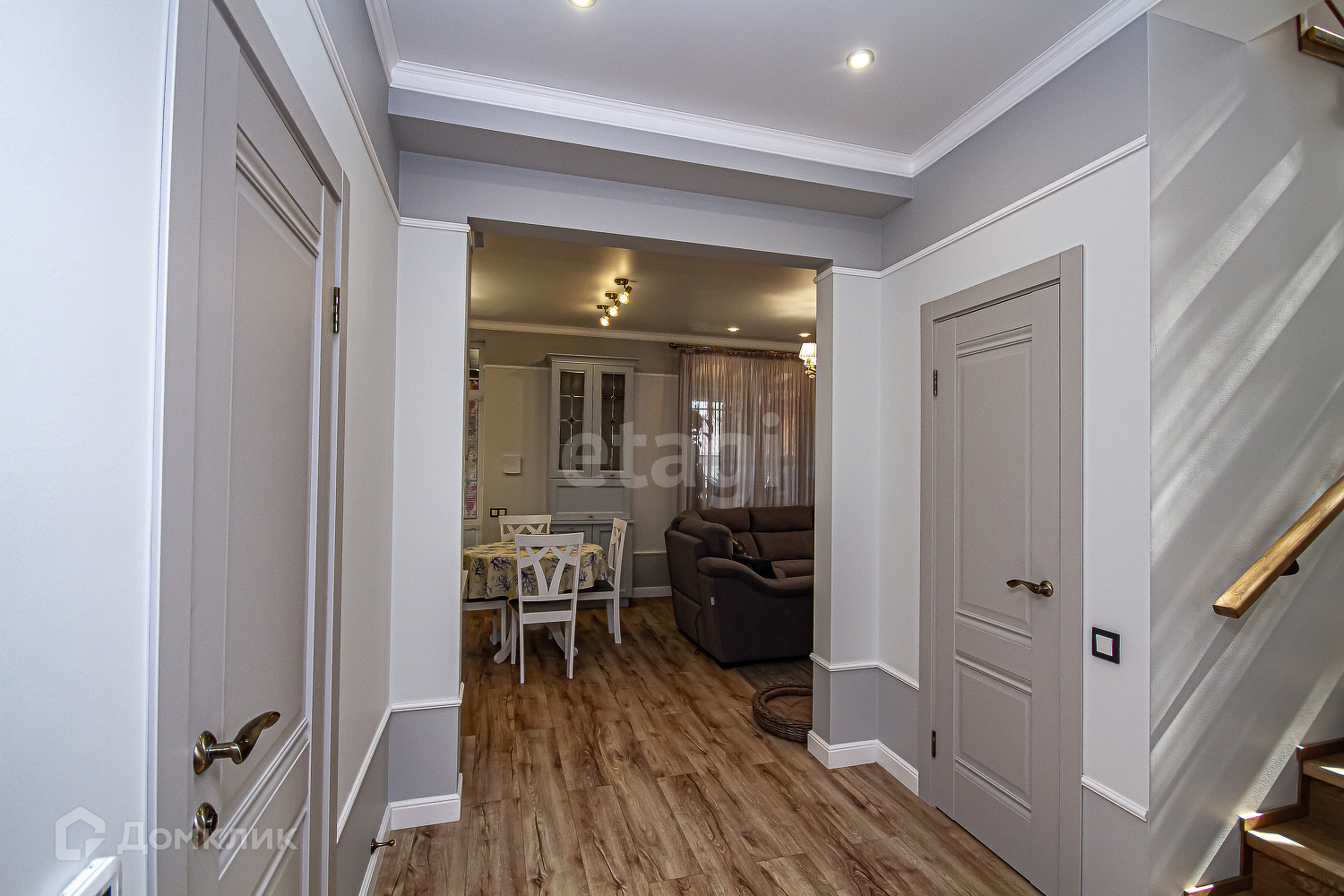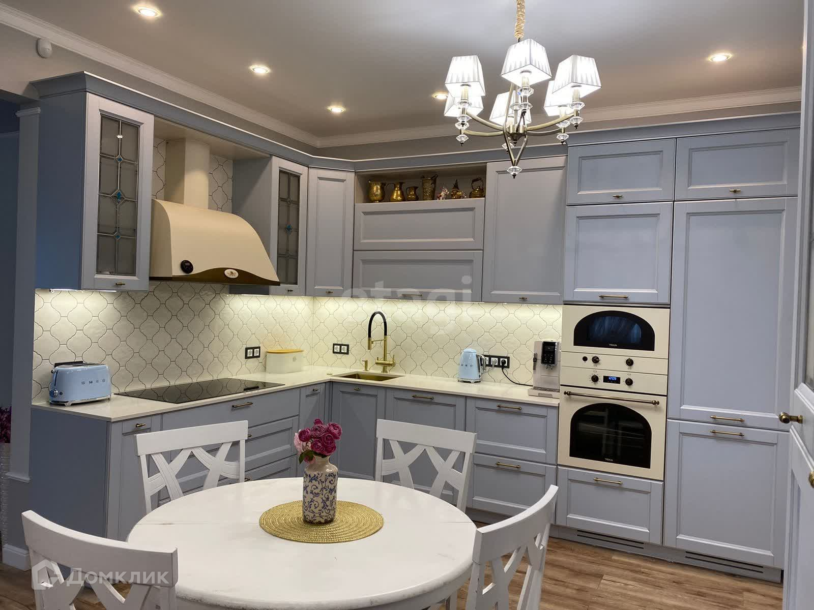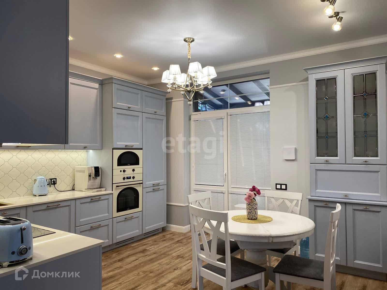 На первом этаже: Кухня-гостиная с электрическим камином. Кухонная зона из окрашенных фасадов МДФ, столешница из натурального кварцевого камня, встроенная немецкая техника "Teka", встроенный холодильник, а также посудомоечная машина "Neff",, установлен японский измельчитель продуктов , а также мойка и смеситель фирмы Omoikiri. Гостевая комната, кладовая, санузел. Просторная прихожая со встроенными шкафами, На застеклённой террасе установлена кухонная зона со встроенной газовой плитой для приготовления пищи летом и в солнечные дни зимой.