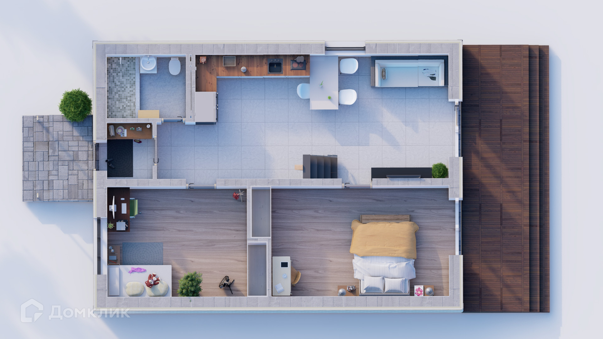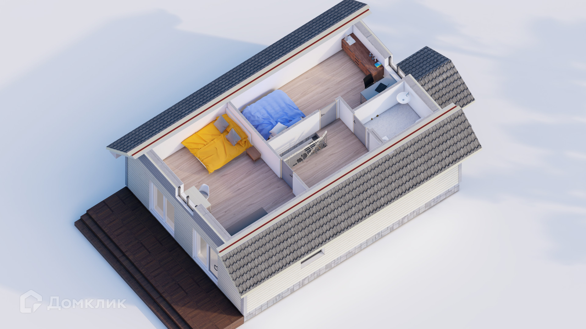 1-ой этаж : 72 м² (кухня-гостиная 29 м², спальная 19 м², спальная 15,5 м², санузел 5,7 м²)