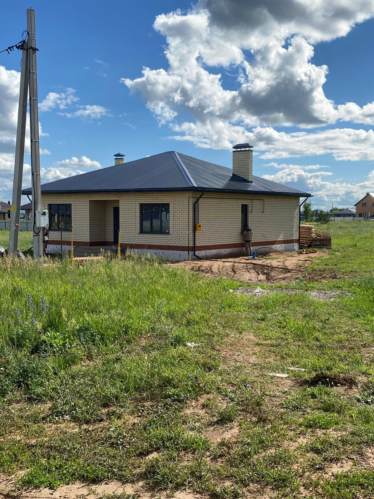 В дом уже заведены все коммуникации: газ, отопление, вода (скважина), установлен септик, газовый котел. Теплые полы по всей площади. По периметру дома будет  установлен забор из профнастила, а так же есть отмостки.