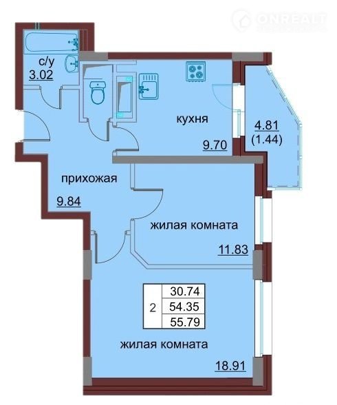 Общая площадь 55.8 м2