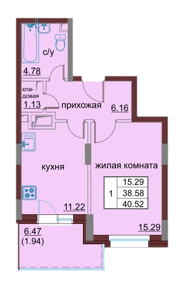 Общая площадь 40.52 м2