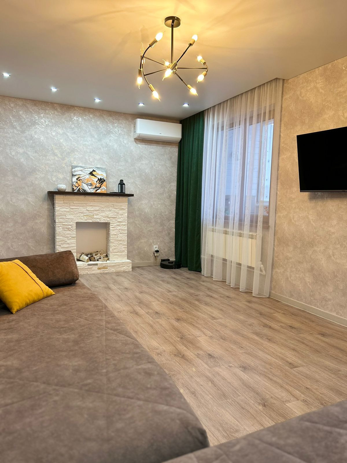 Остаются кухонный гарнитур, кондиционер, спальный гарнитур, камин.