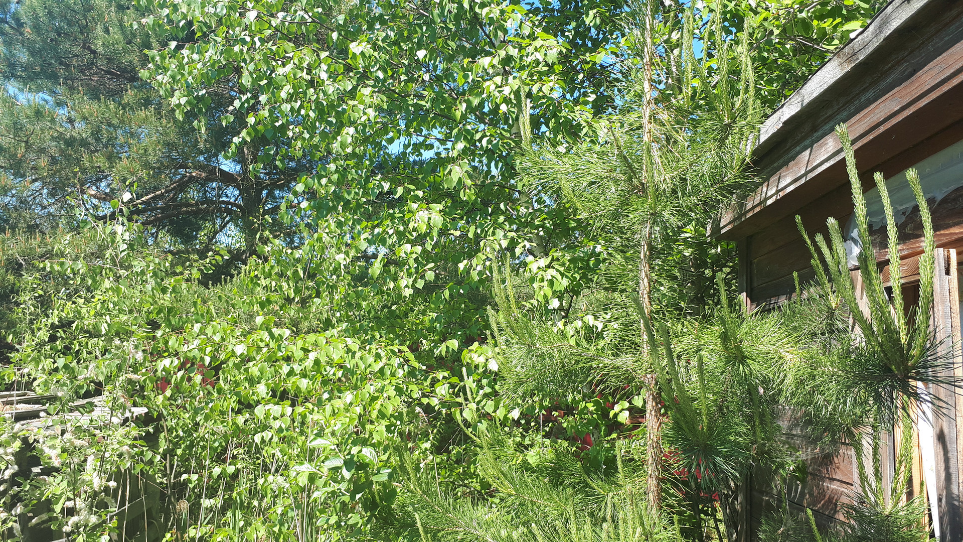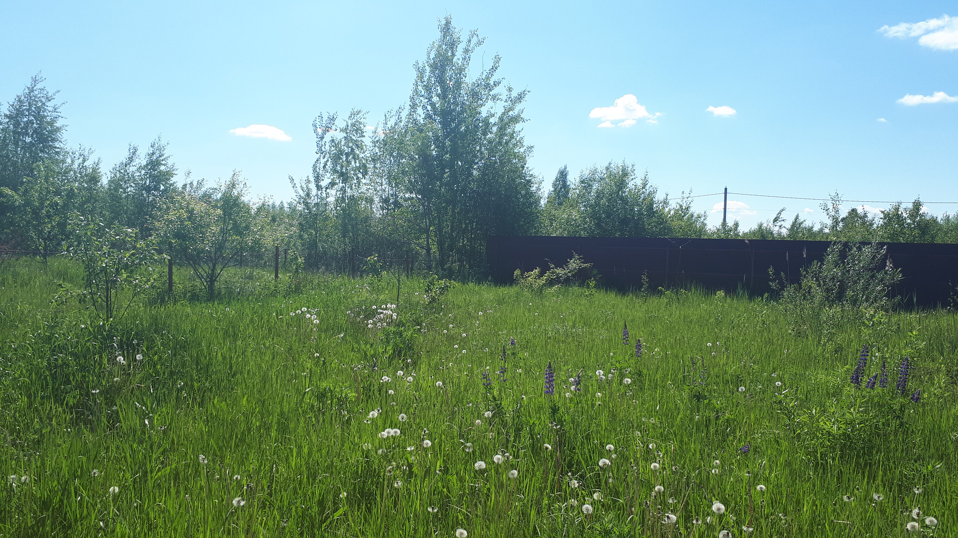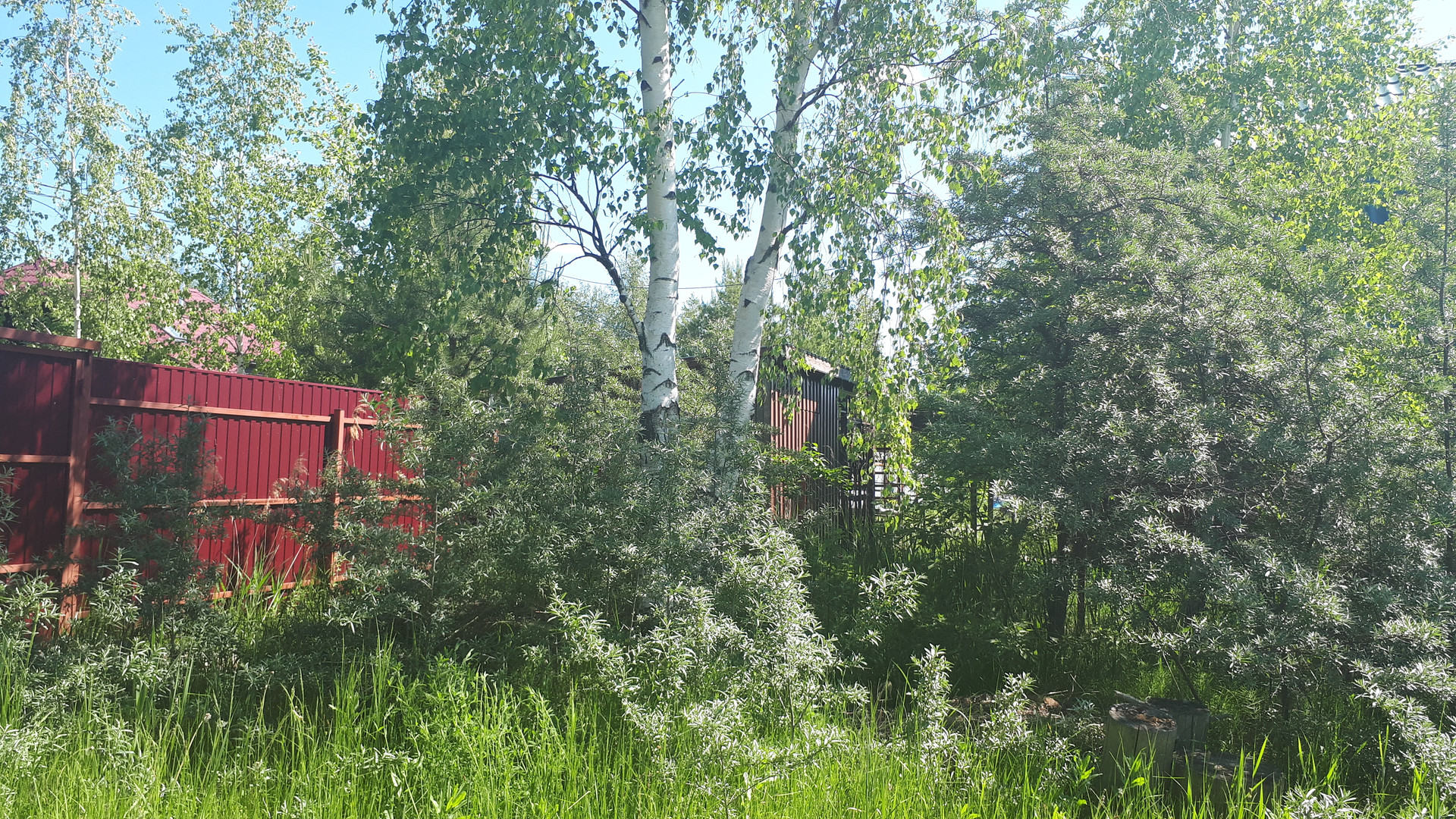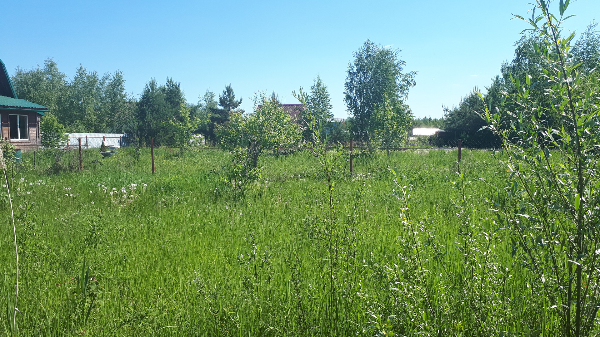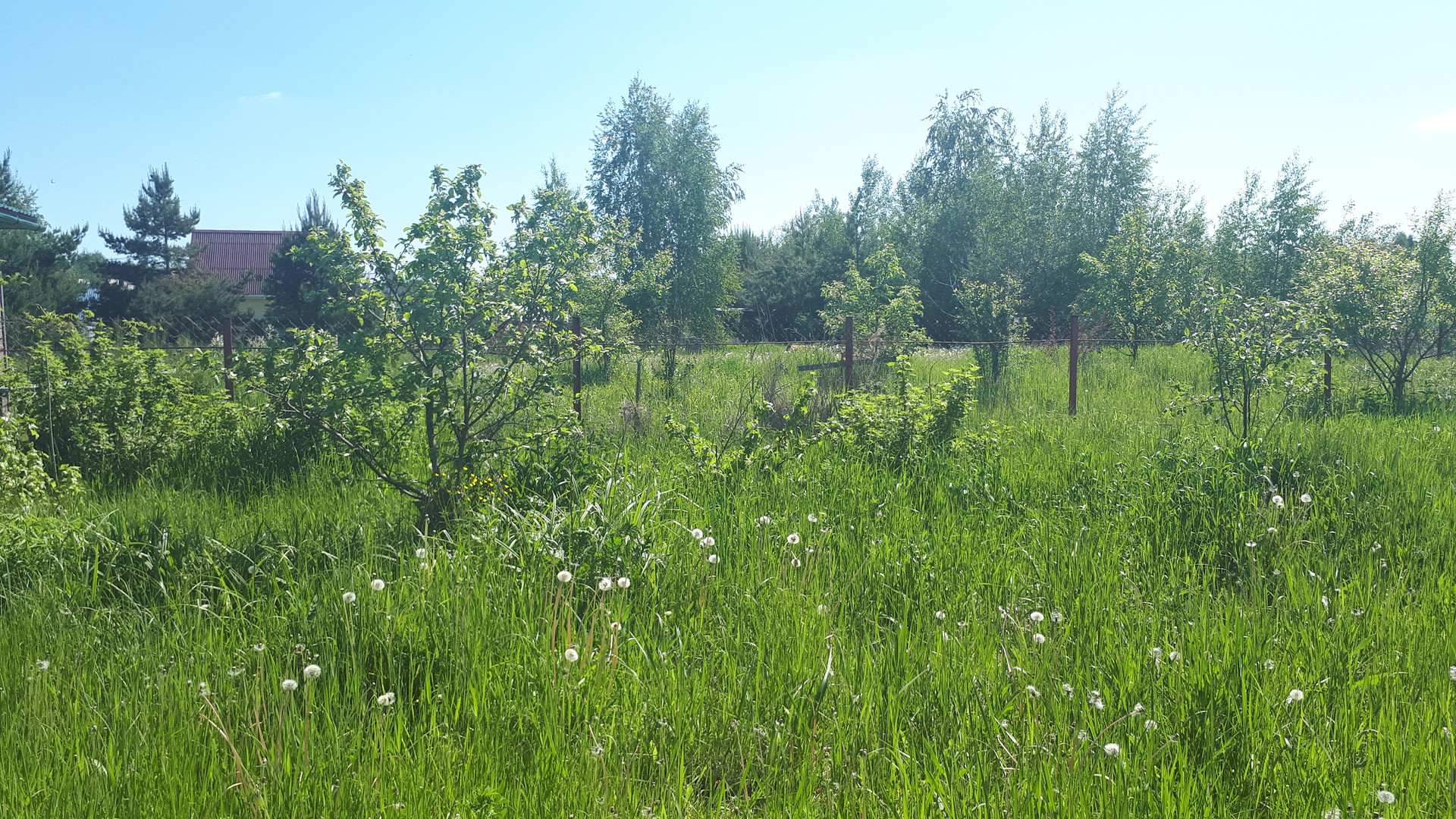 Участок обработан- посажены сортовые яблони, кустики клубники, декоративные растения- сирень, ива, хвойники.