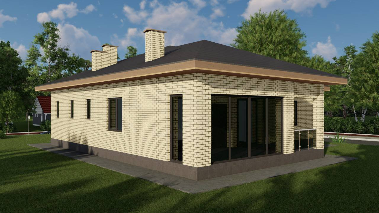 Планировка дома сделана по четко выверенному проекту: крыльцо 3м2, прихожая 4,9 м2, холл 7 м2, кухня-гостиная 31 м2, санузел-1 (2,9) м2, кладовая 4,2 м2, топочная-постирочная 6,6 м2, гардеробная 6,1, санузел-2 (6,2) м2, спальная-1 (14,8) м2, спальная-2 (14,8) м2, спальня-3 (18,2), холл-2 (9,8), крытая терраса 14,4 м2, патио зона 6,3 м2.