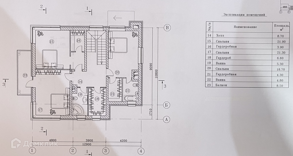 -второй этаж: холл-8,7 м2, спальня-21,9 м2, гардеробная-3,9 м2, спальня-21,3 м2, гардероб-6,6 м2, ванна-5,3 м2, спальня-18,7 м2, гардеробная-4,3 м2, ванна-4,8 м2, балкон-8,5 м2.