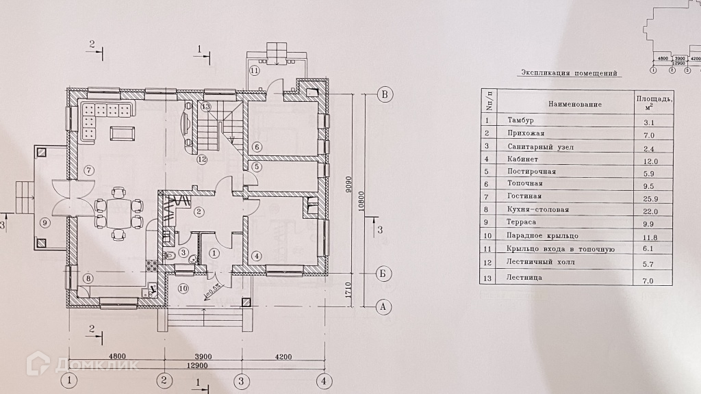 -Первый этаж: Тамбур- 3,1 м2, прихожая-7.0 м2, санитарный узел-2,4 м2, кабинет-12,0 м2, постирочная-5,9 м2, топочная-9,5 м2, гостиная-25,9 м2, кухня-столовая-22,0 м2, терраса-9,9 м2, парадное крыльцо-11,8 м2, крыльцо входа в топочную-6,1 м2, лестничный холл-5.7 м2, лестница-7,0 м2.