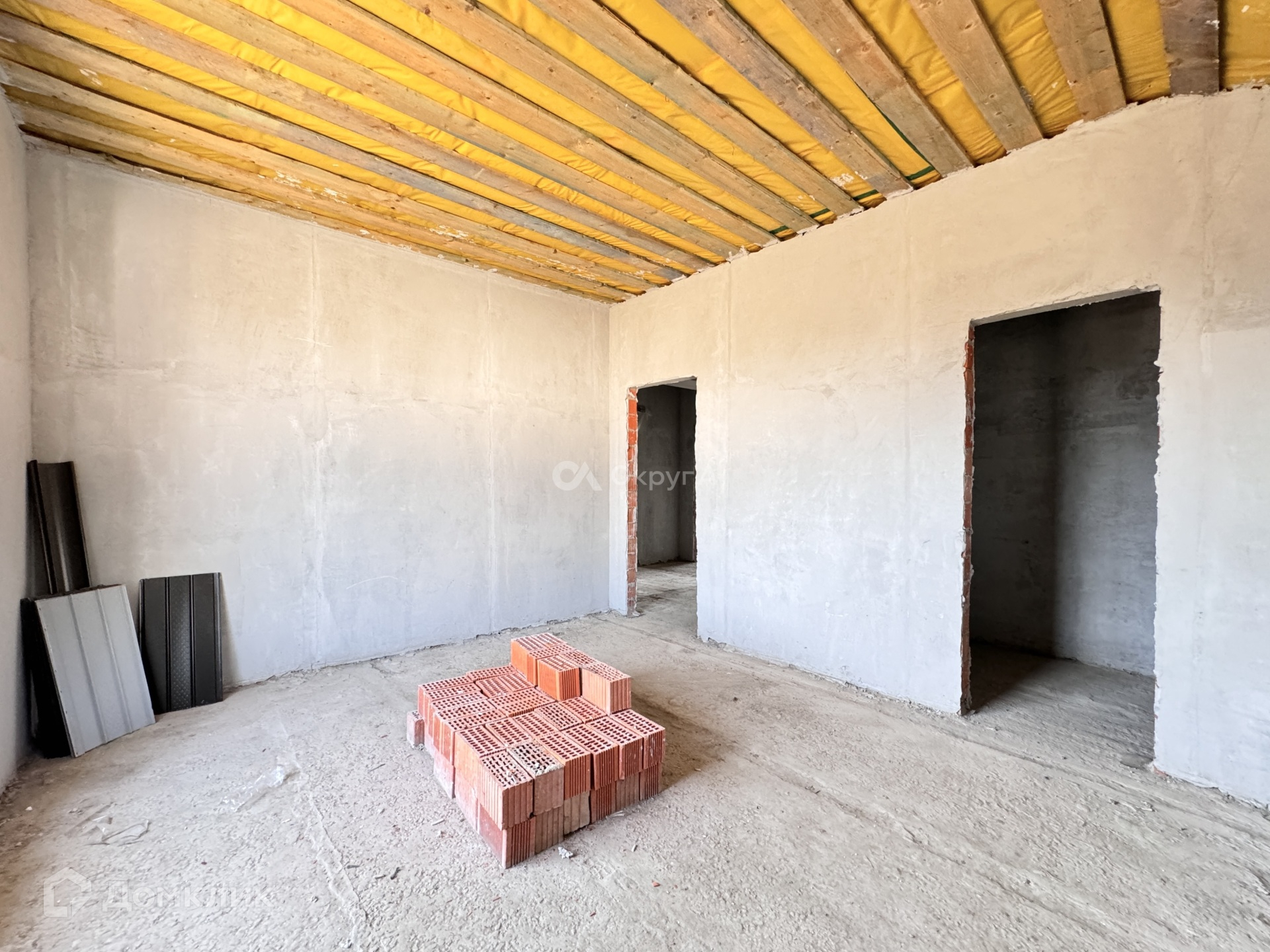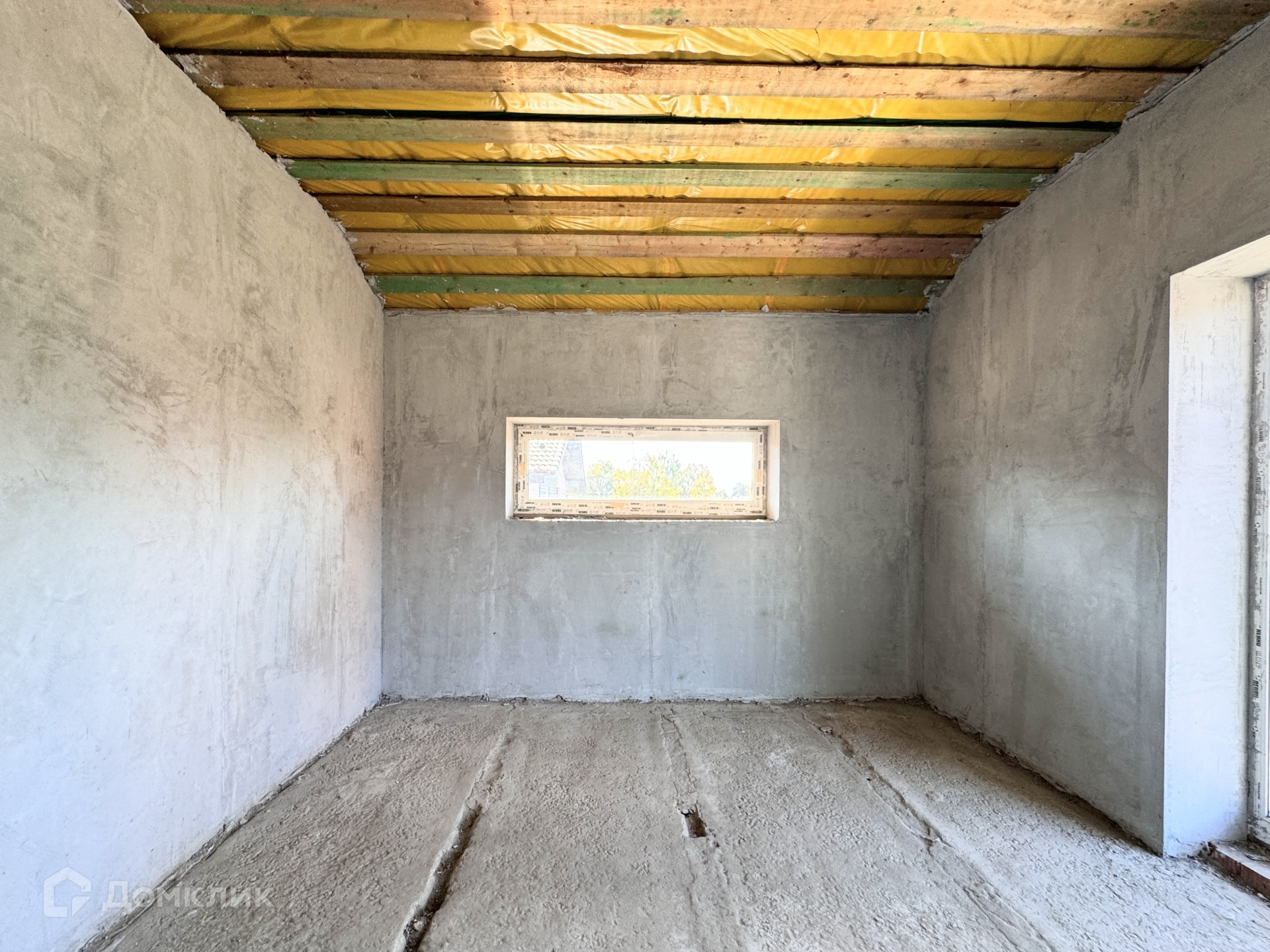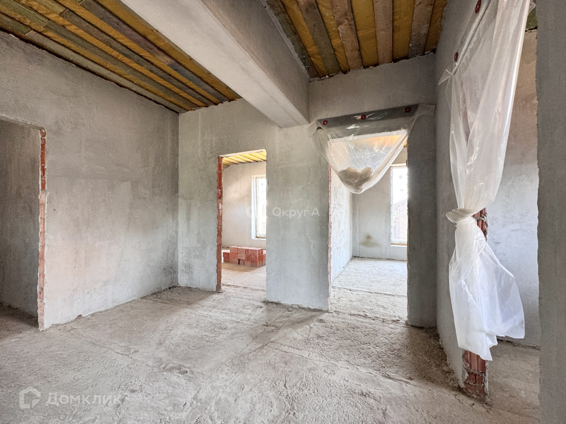 Планировка дома по проекту: 1 этаж - прихожая, просторная кухня-гостиная 49 кв м, комната (гостевая или кабинет) 12,5 кв м, 1 с/у, котельная. На 2 этаж ведет бетонная лестница, где расположены: прихожая, 3 изолированные комнаты по 17,5 кв м, 2 с/у.