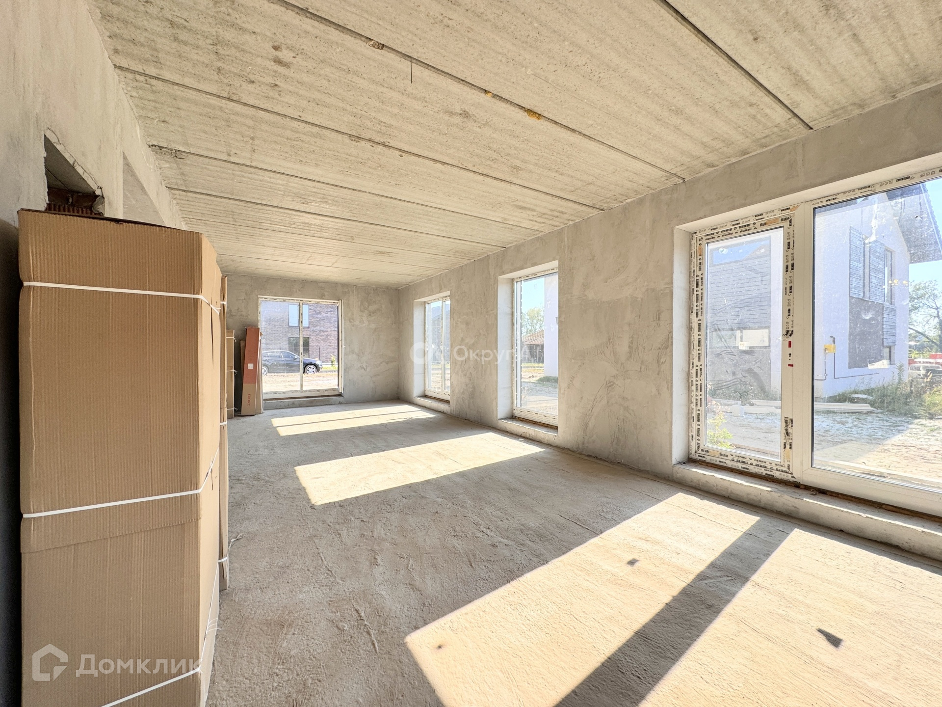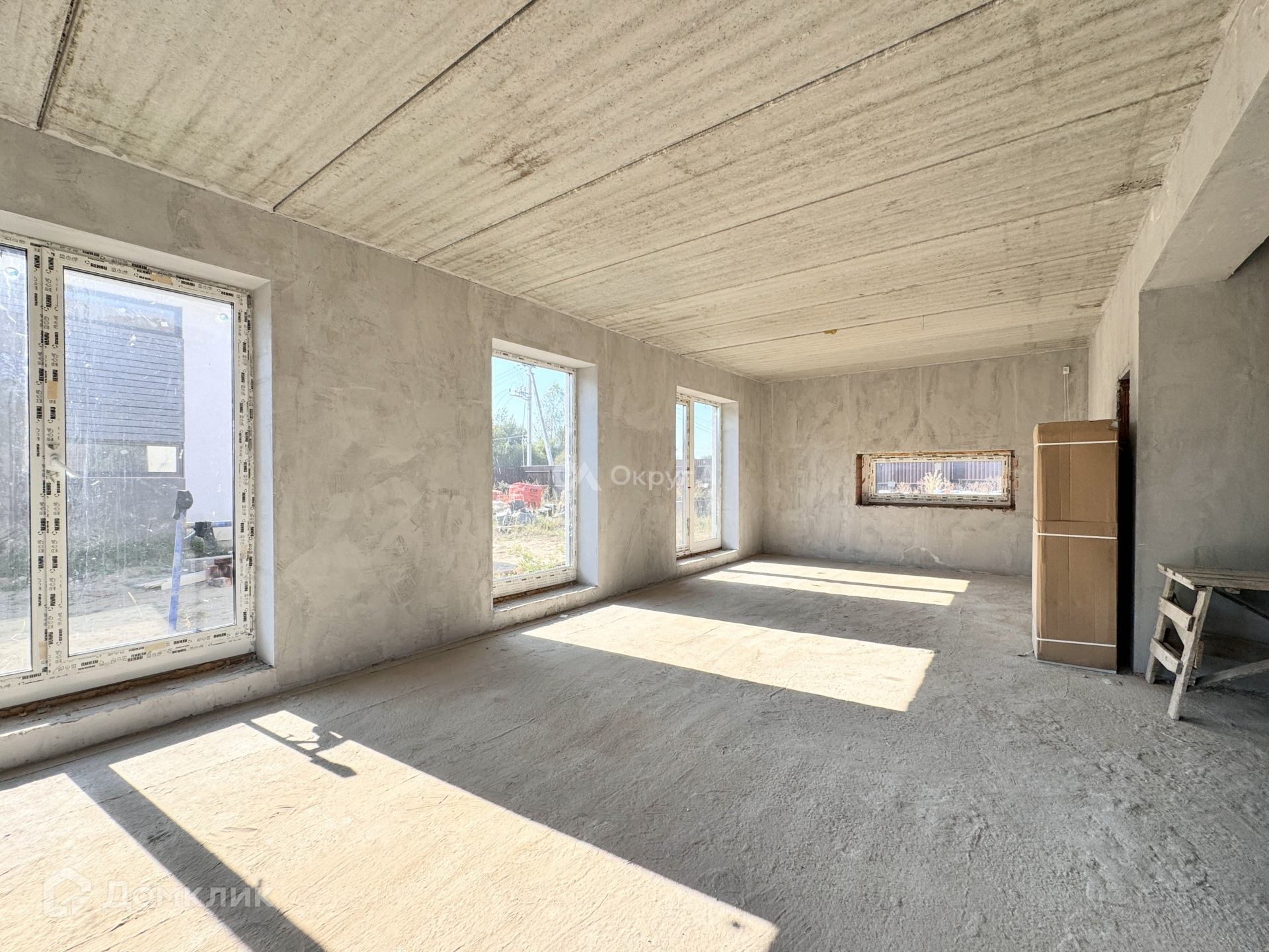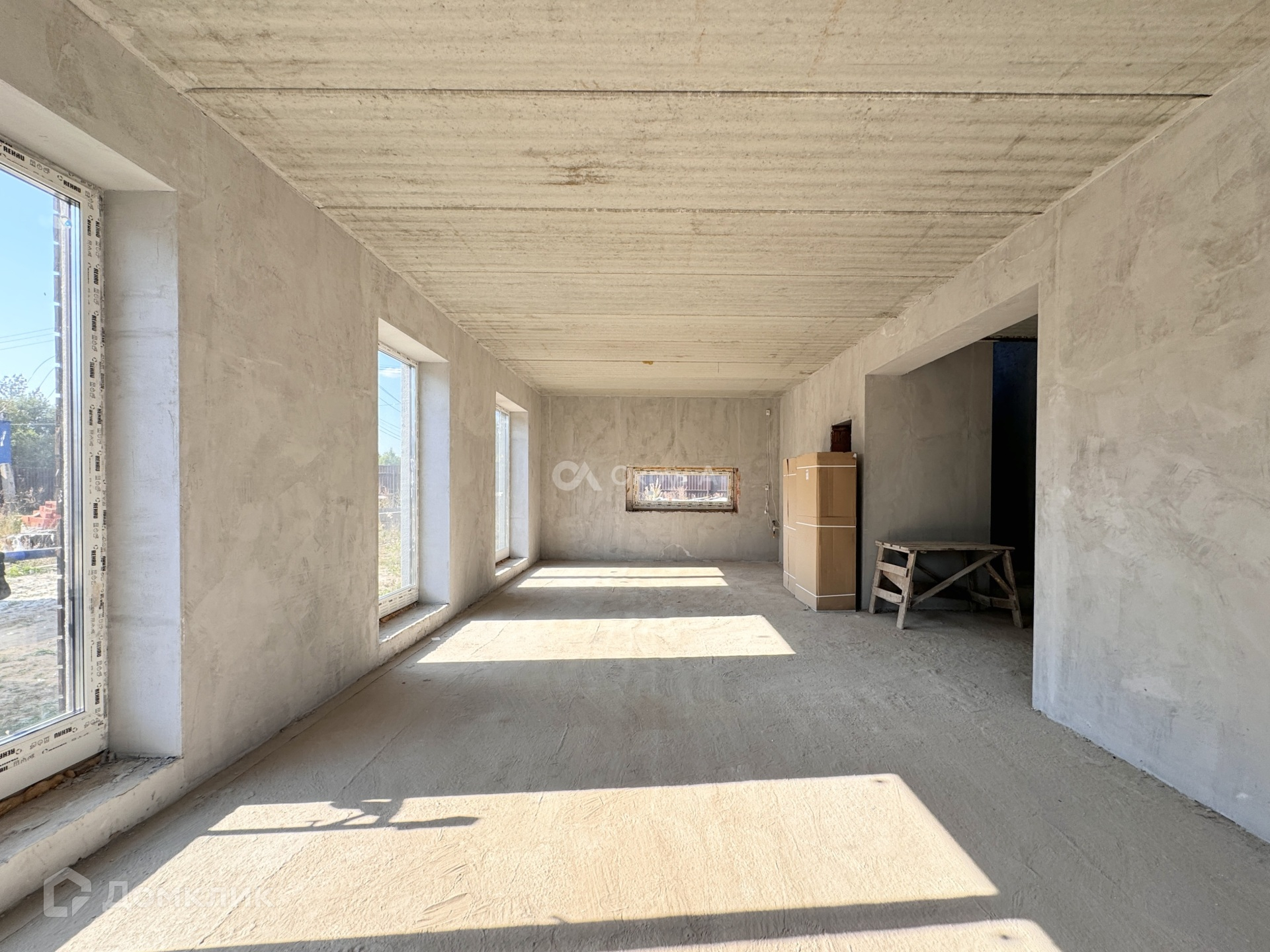 Планировка дома по проекту: 1 этаж - прихожая, просторная кухня-гостиная 49 кв м, комната (гостевая или кабинет) 12,5 кв м, 1 с/у, котельная. На 2 этаж ведет бетонная лестница, где расположены: прихожая, 3 изолированные комнаты по 17,5 кв м, 2 с/у.