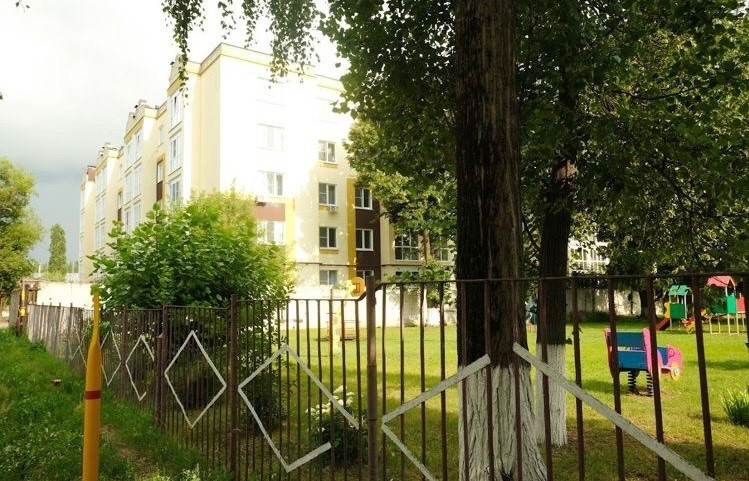 Квартира с видом на мини-стадион и детскую площадку.