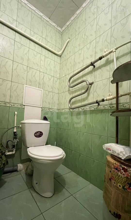 Санузел в плитке, довольно-таки вместительный.