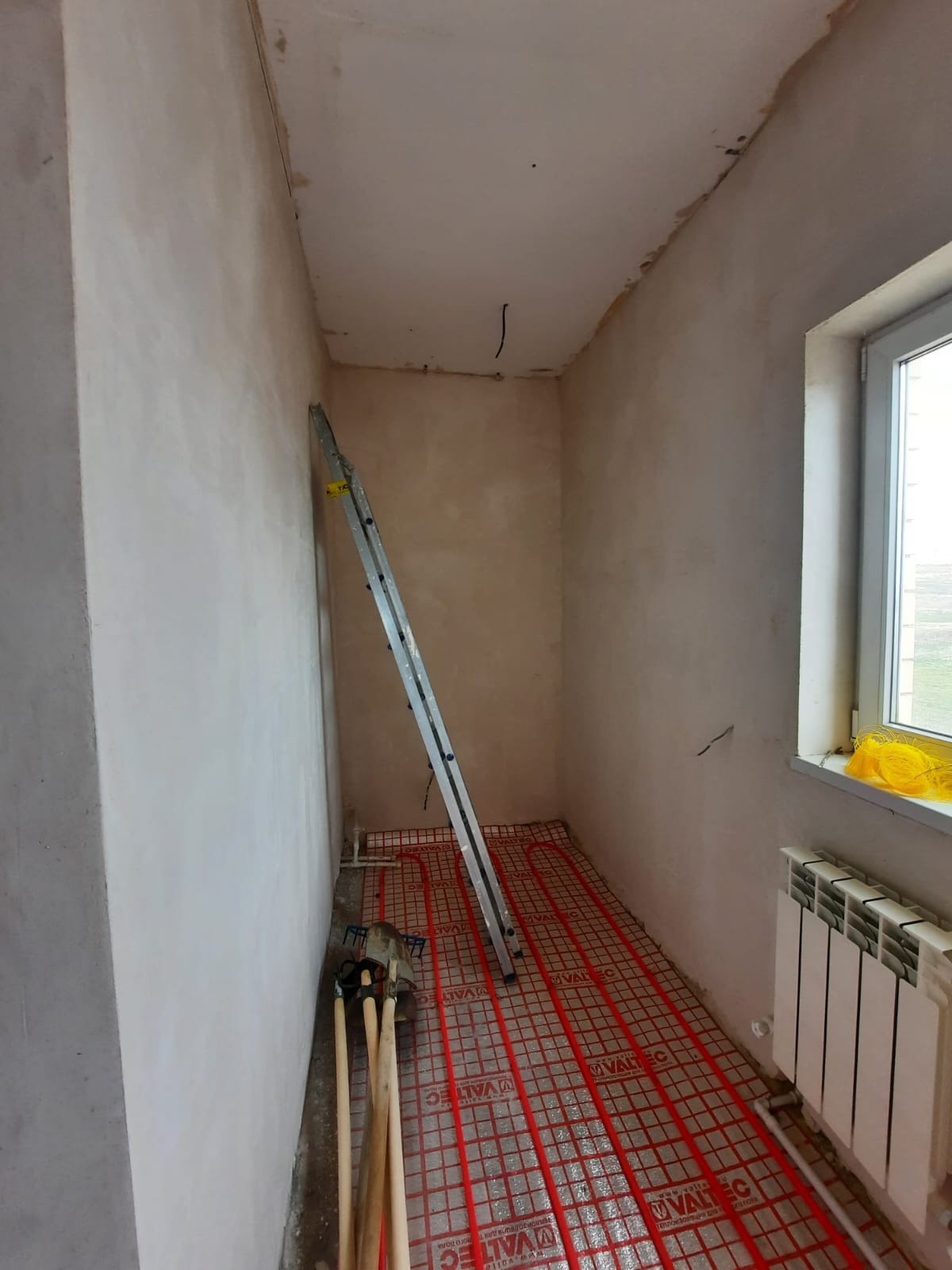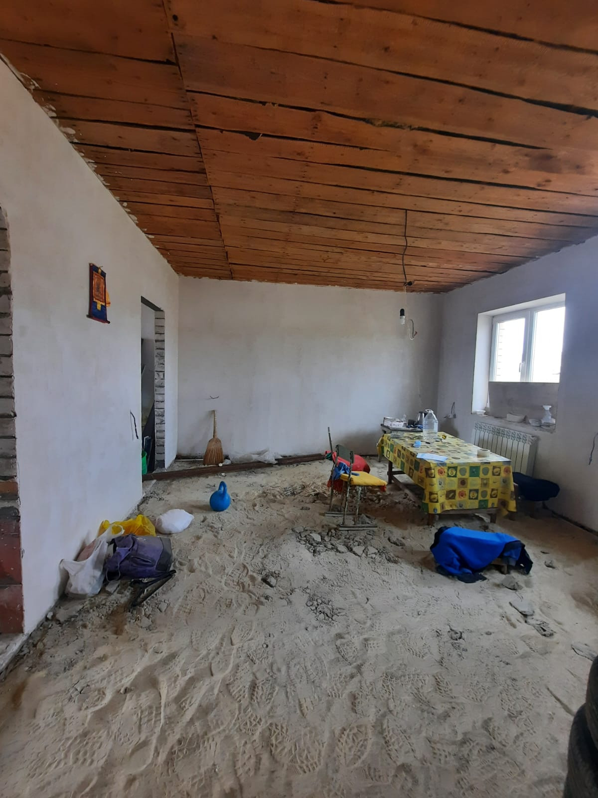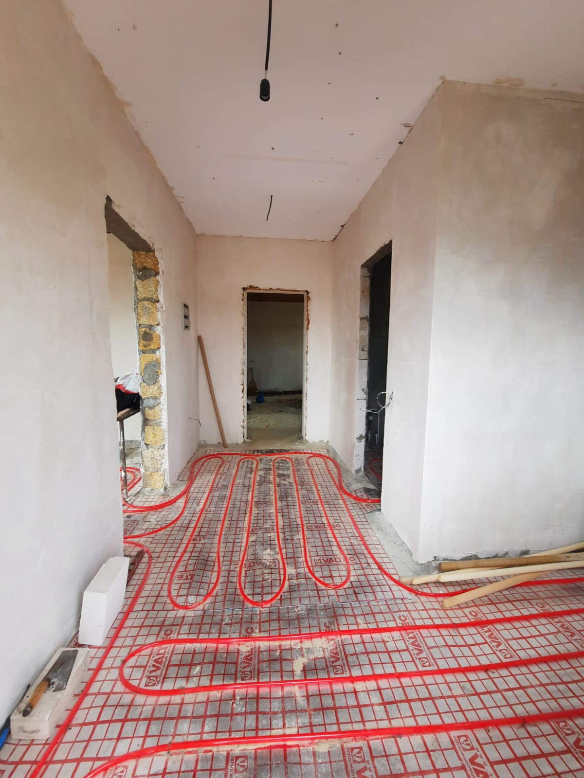 Стены выровнены и заштукатурены под обои, электропроводка и отопление по дому проведена.