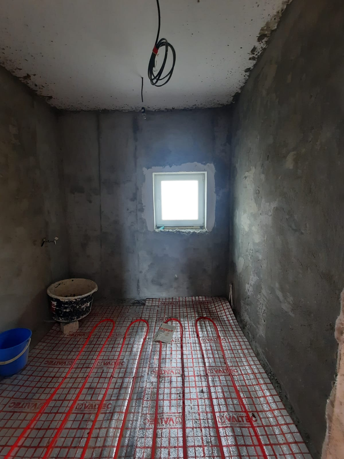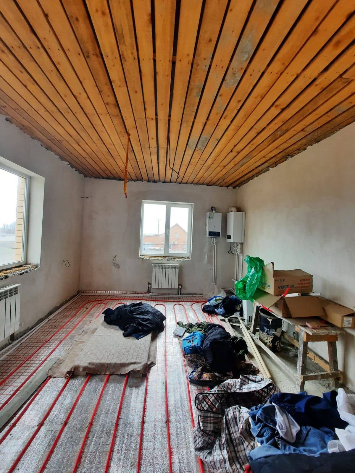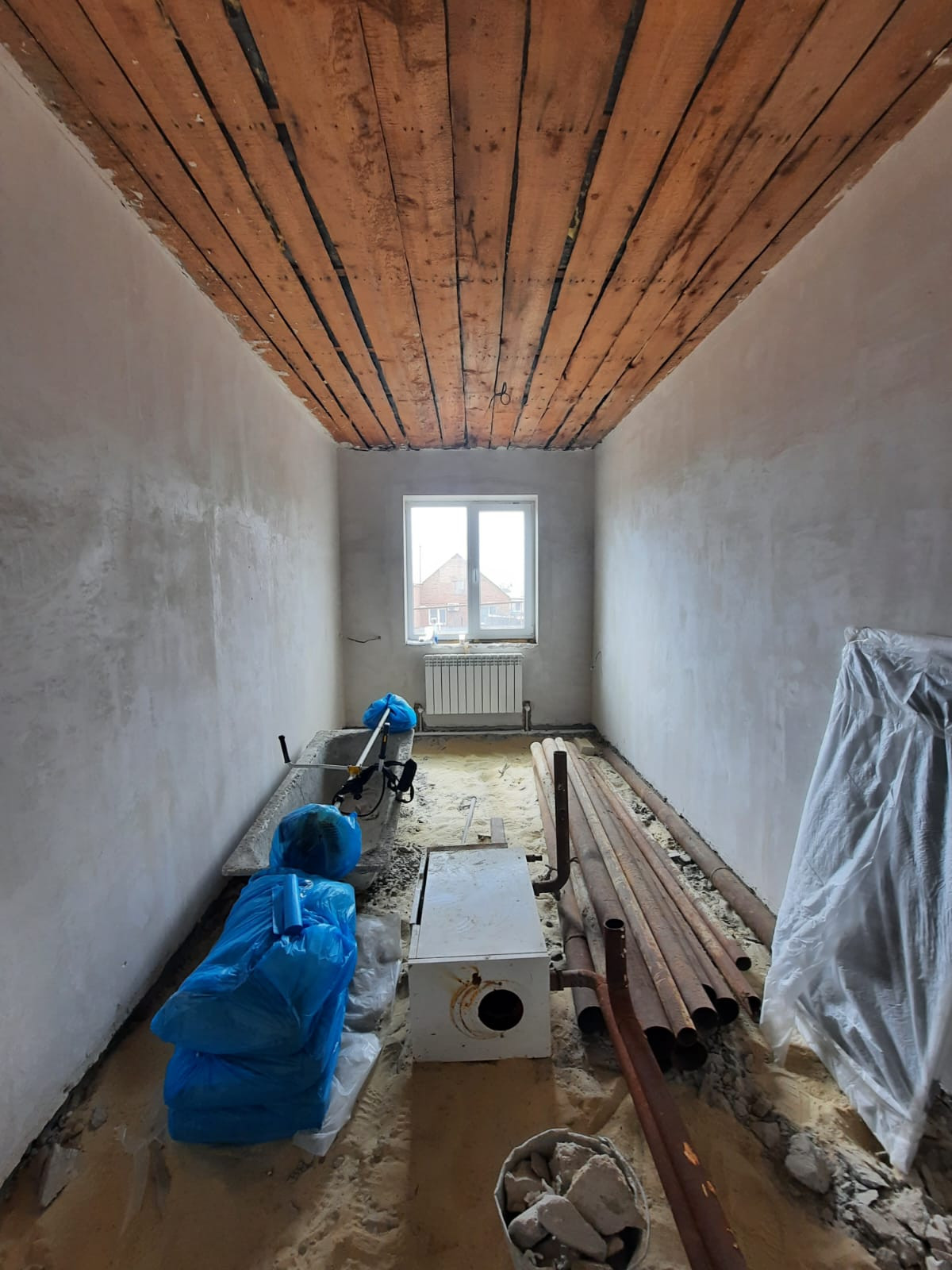 Стены выровнены и заштукатурены под обои, электропроводка и отопление по дому проведена.