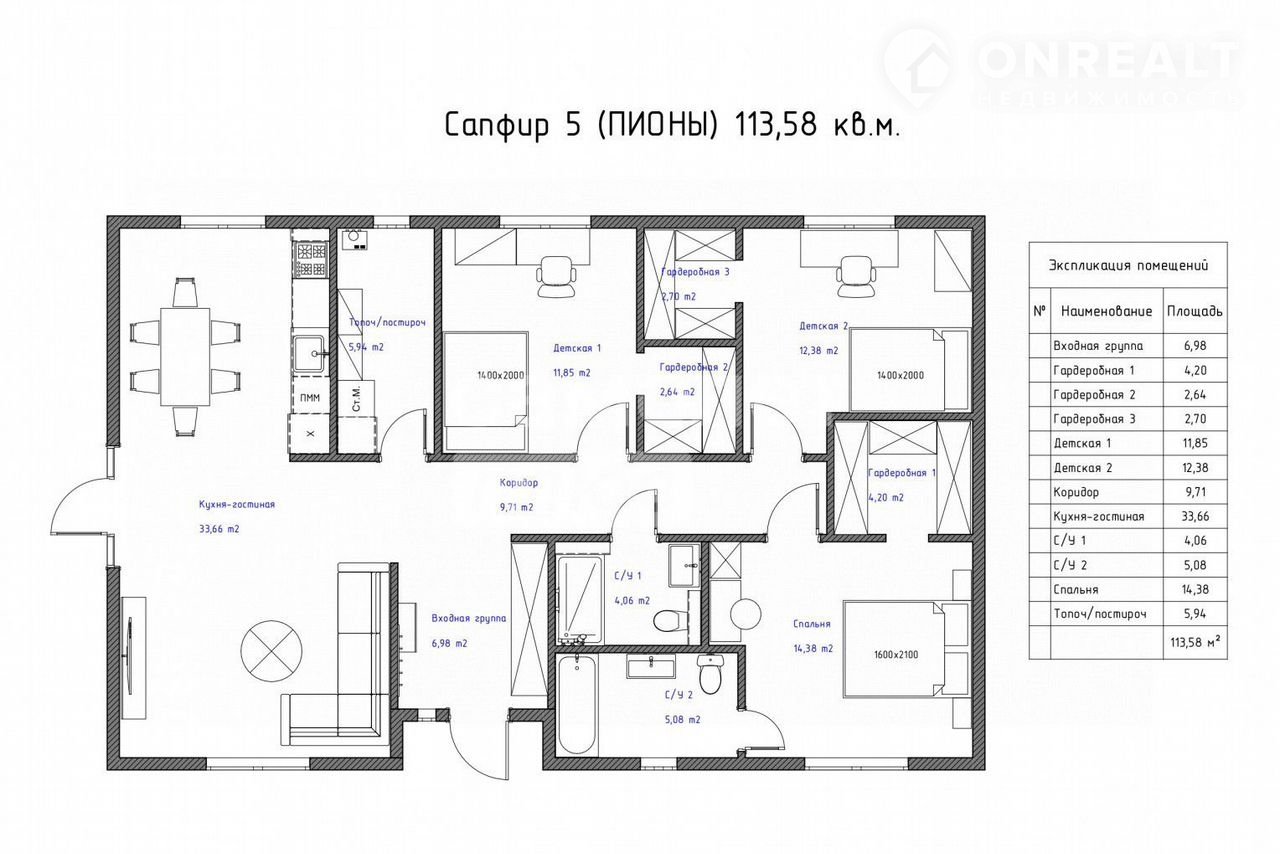 - Просторная кухня-гостиная площадью 33,66 м² с выходом на террасу.