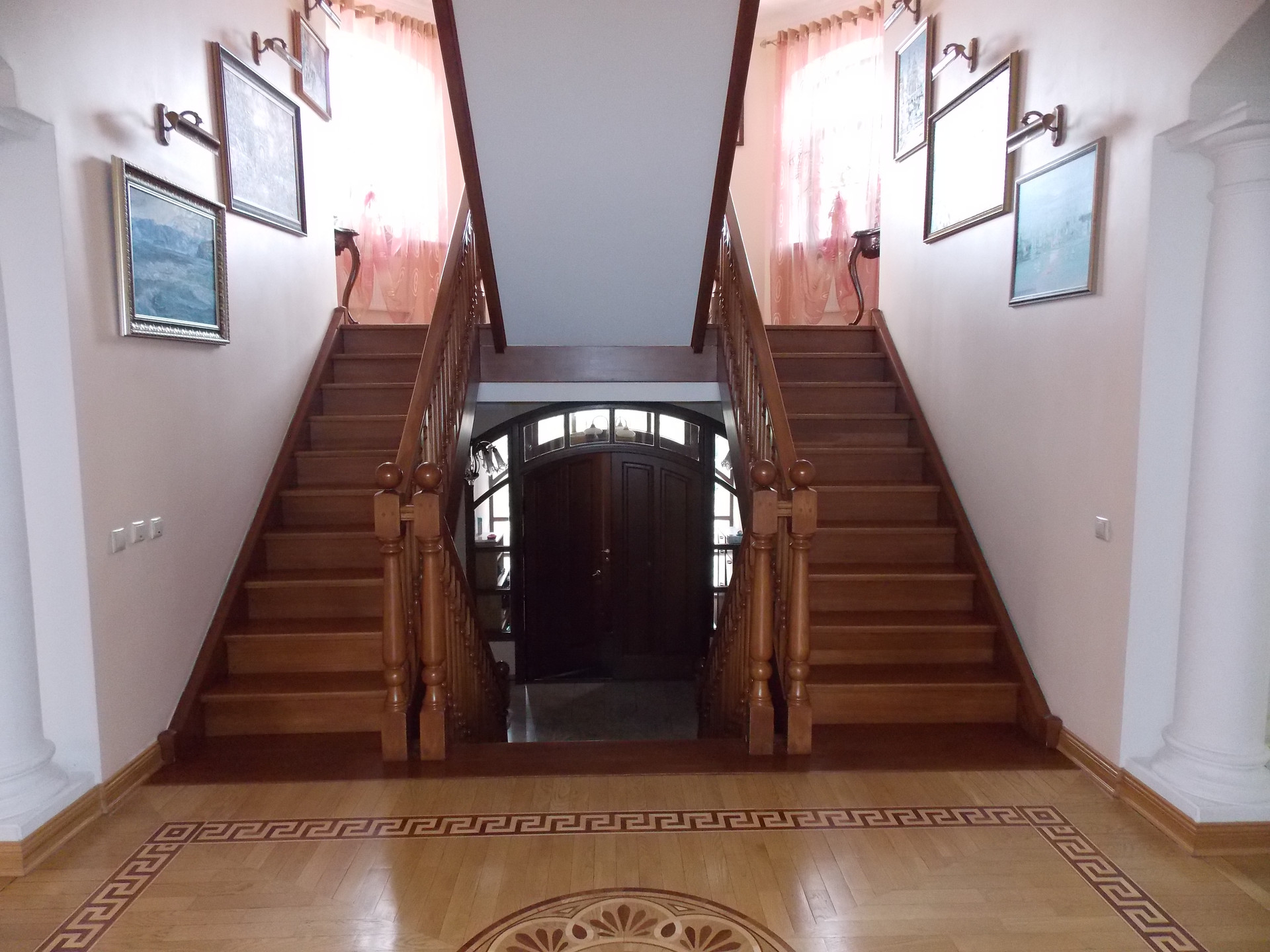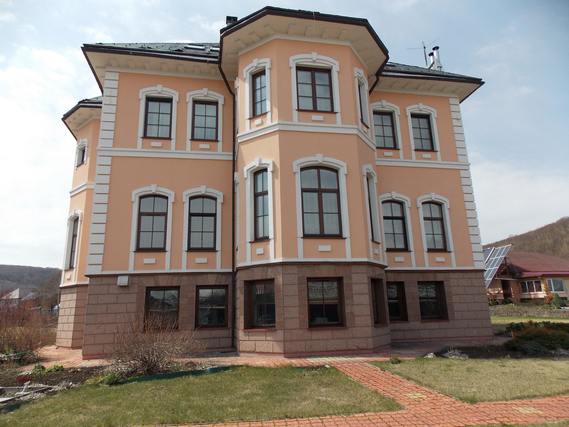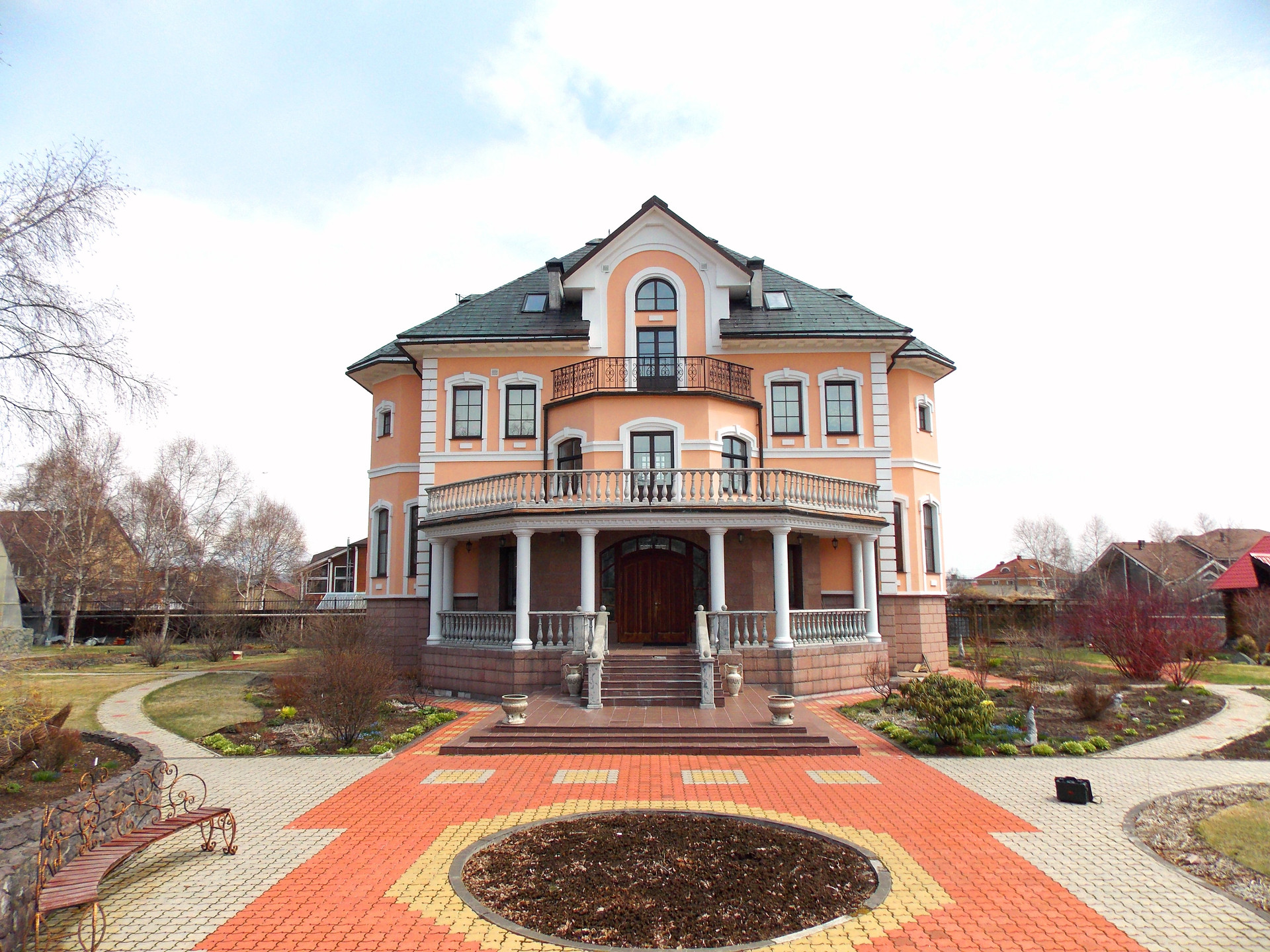 Великолепный! Великолепный дом-усадьба в архитектурном стиле - неоклассицизм, классическая архитектура, понятные формы и геометрия, симметрия и пропорции, фронтон на портике, парадное крыльцо с классическим фронтоном наверху, дверь расположена в центре здания. Прочные строительные материалы -цокольный этаж снаружи выложен гранитными плитами красного цвета, внутри выложен природным камнем, сам дом построен из лучшего природного строительного материала – лиственница, экология и долговечность, а в облике - гармония, симметрия и упорядоченность.