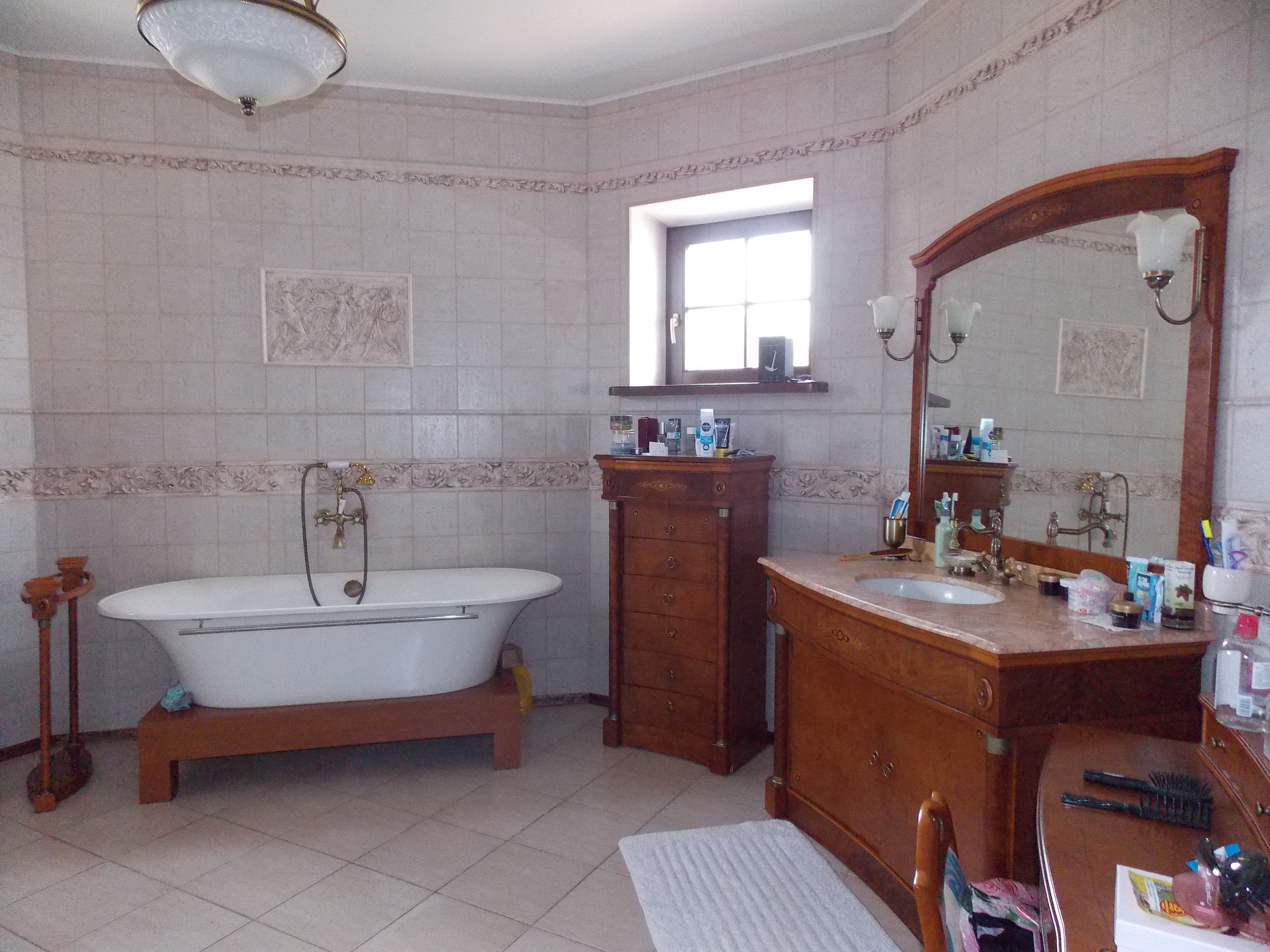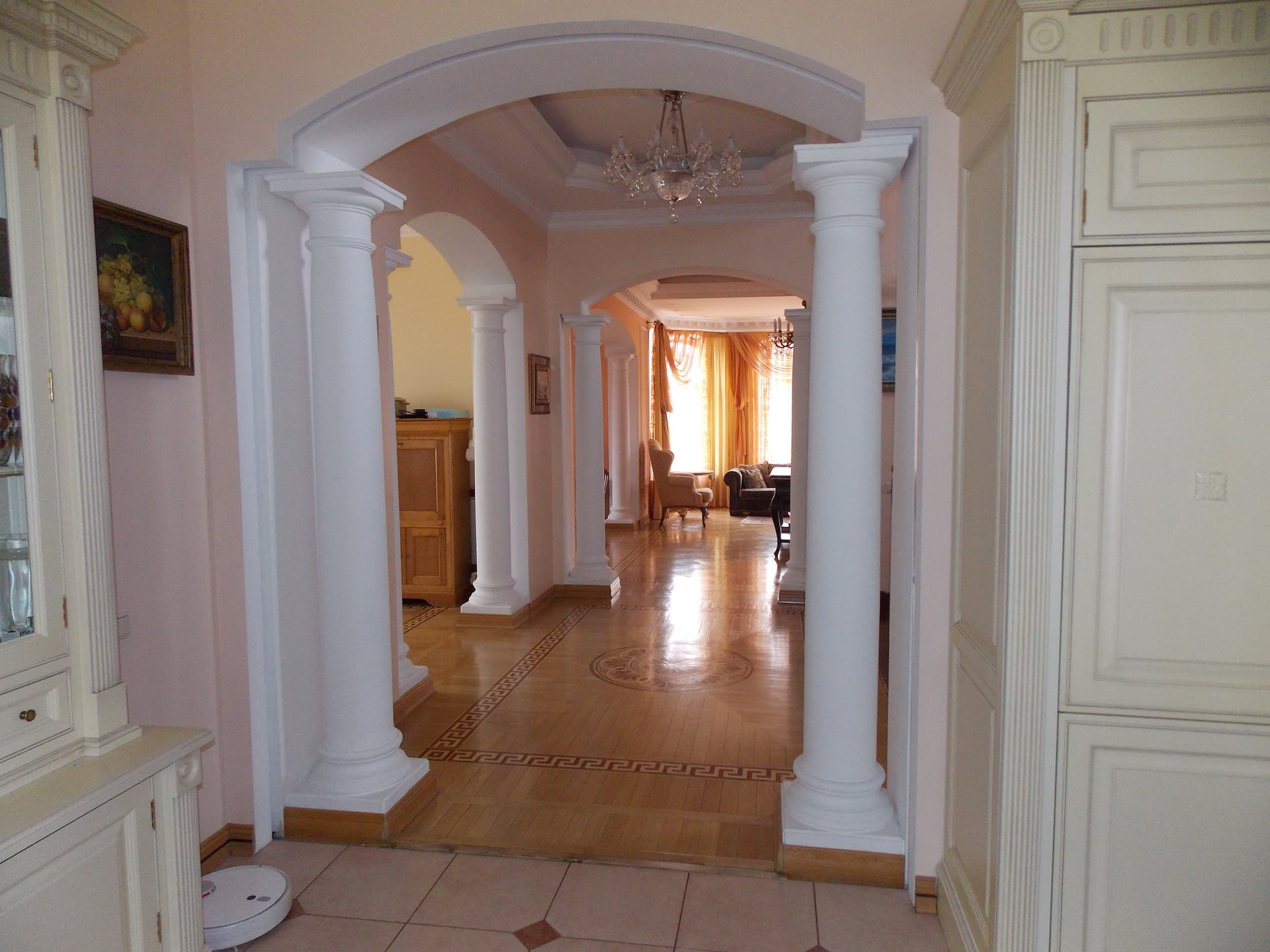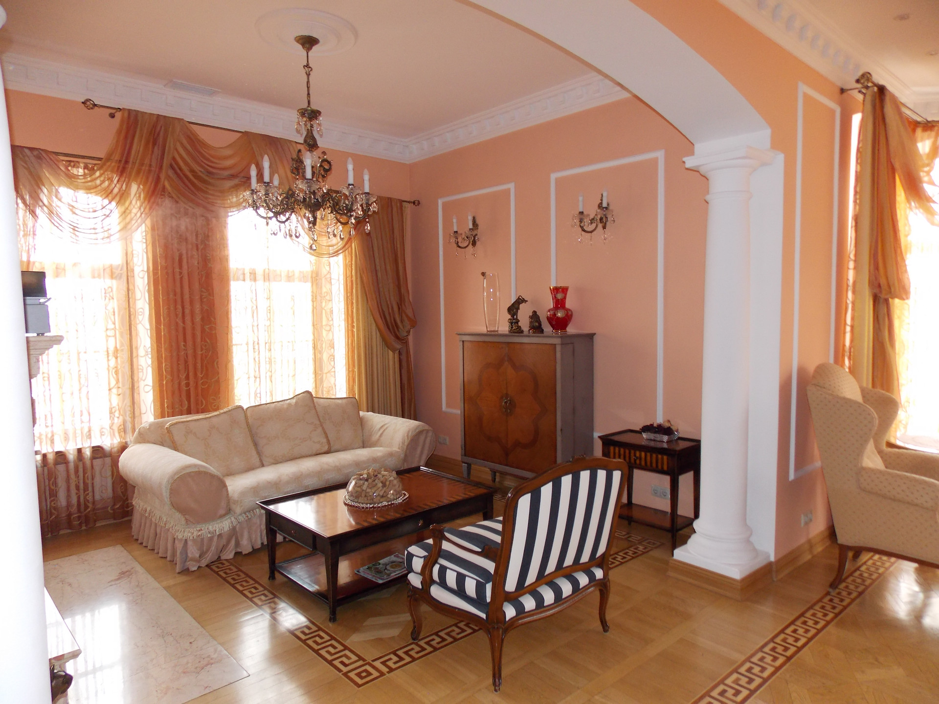 Великолепный! Великолепный дом-усадьба в архитектурном стиле - неоклассицизм, классическая архитектура, понятные формы и геометрия, симметрия и пропорции, фронтон на портике, парадное крыльцо с классическим фронтоном наверху, дверь расположена в центре здания. Прочные строительные материалы -цокольный этаж снаружи выложен гранитными плитами красного цвета, внутри выложен природным камнем, сам дом построен из лучшего природного строительного материала – лиственница, экология и долговечность, а в облике - гармония, симметрия и упорядоченность.