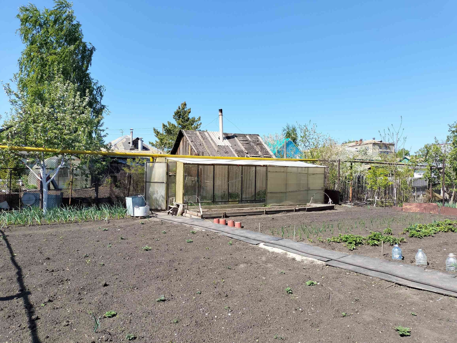 Участок площадью 600 кв.м. Почва плодородная, ежегодно обрабатывается и удобряется. Территория домовладения забетонирована. Во дворе имеется большой кирпичный гараж, банька на газу, летняя кухня и стайки. Огород небольшой но ухоженный, с теплицей и плодоносящими кустарниками.