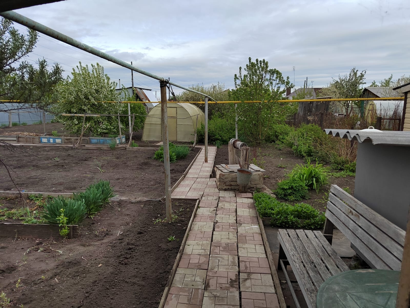 Огород ухоженный, с теплицей и плодоносящими кустарниками, деревьями.