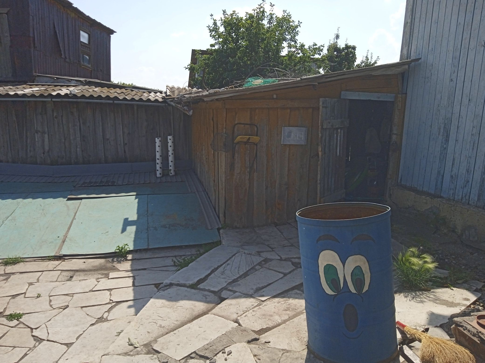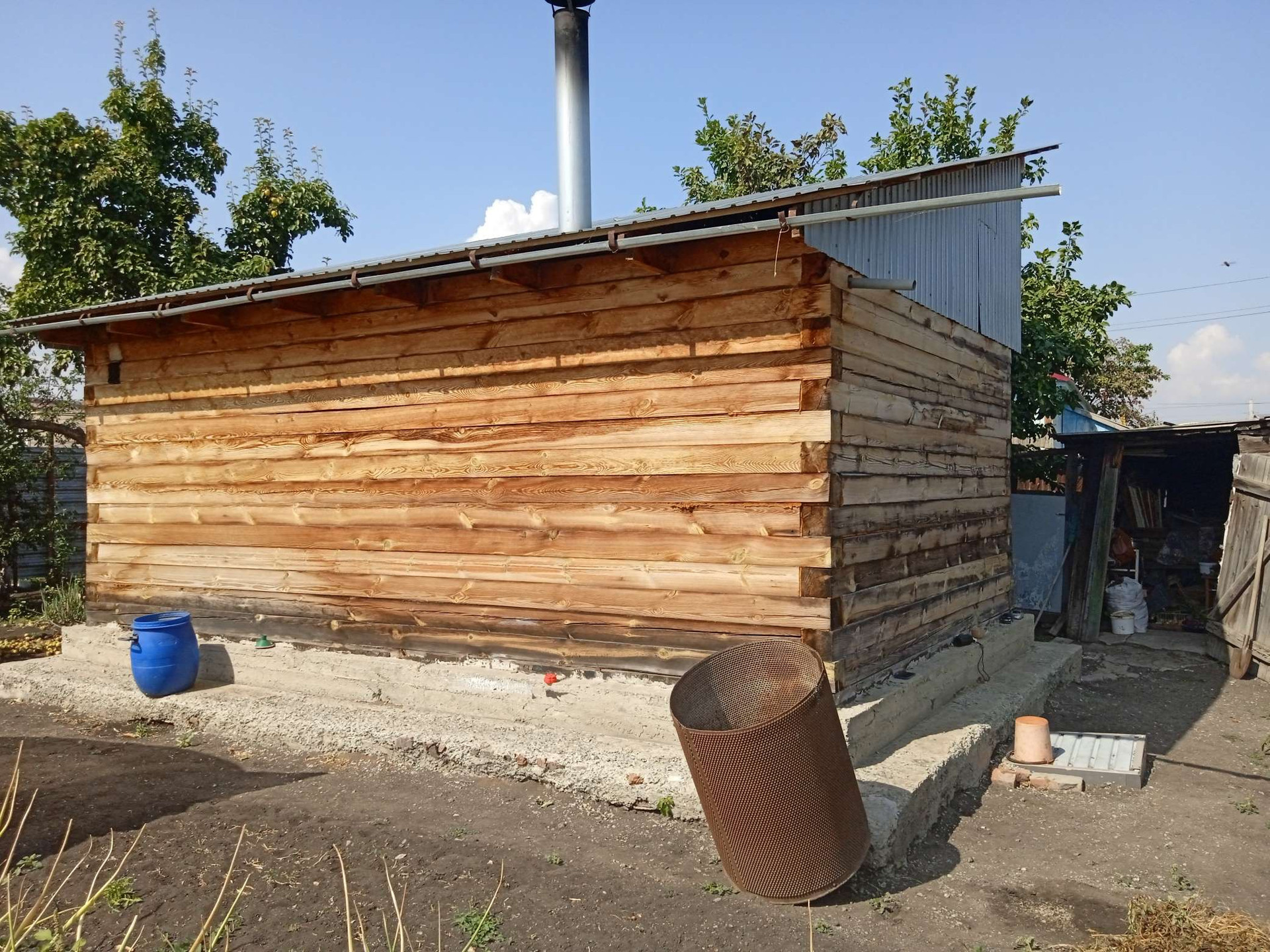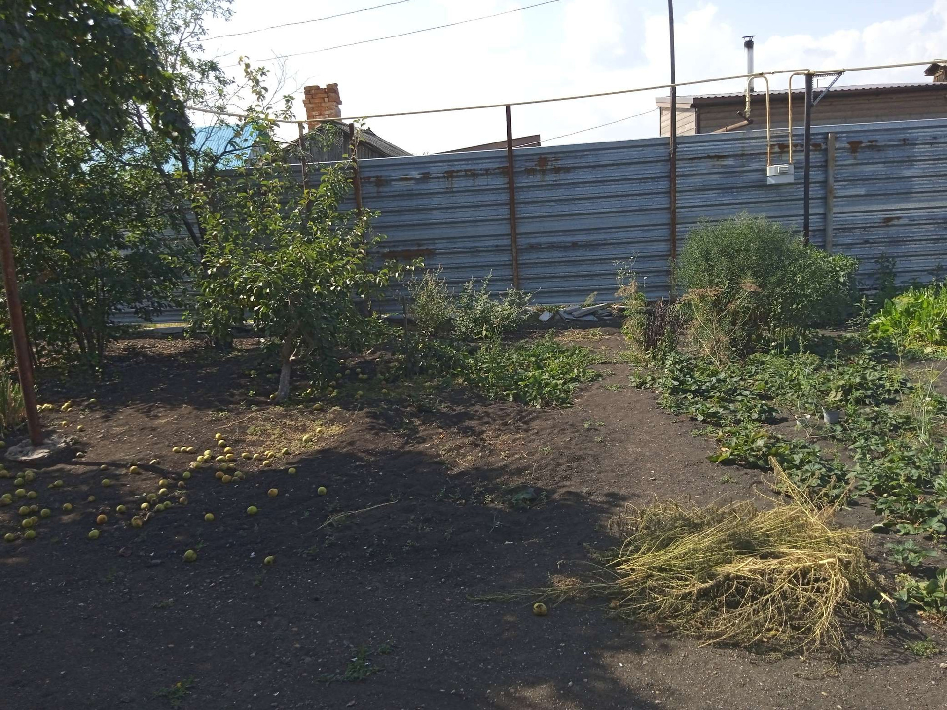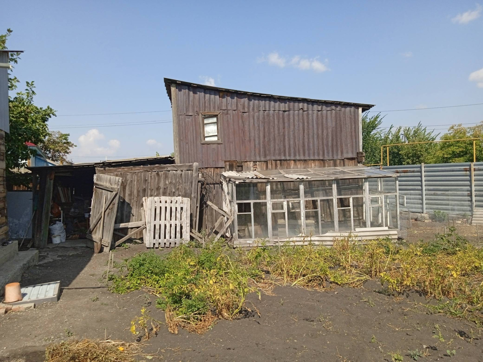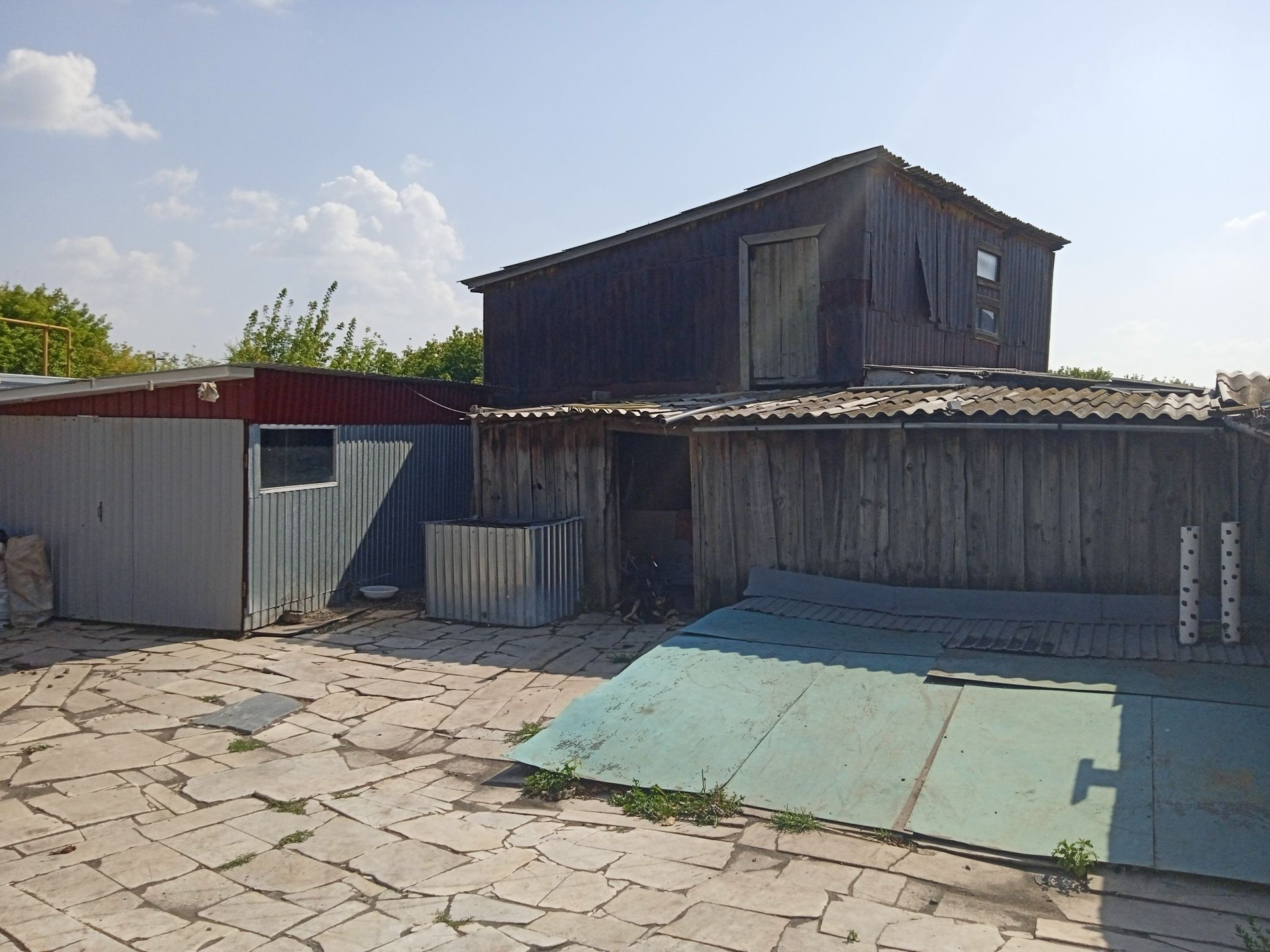 Небольшие сарайки. За домом стоит большая Баня на фундаменте, отапливается газом и дровами. Огород ухоженный растет все, яблони, груши, сливы, виноград, Виктория, ремонтантная малина. Двор выложен камнем.