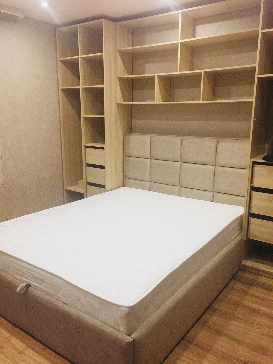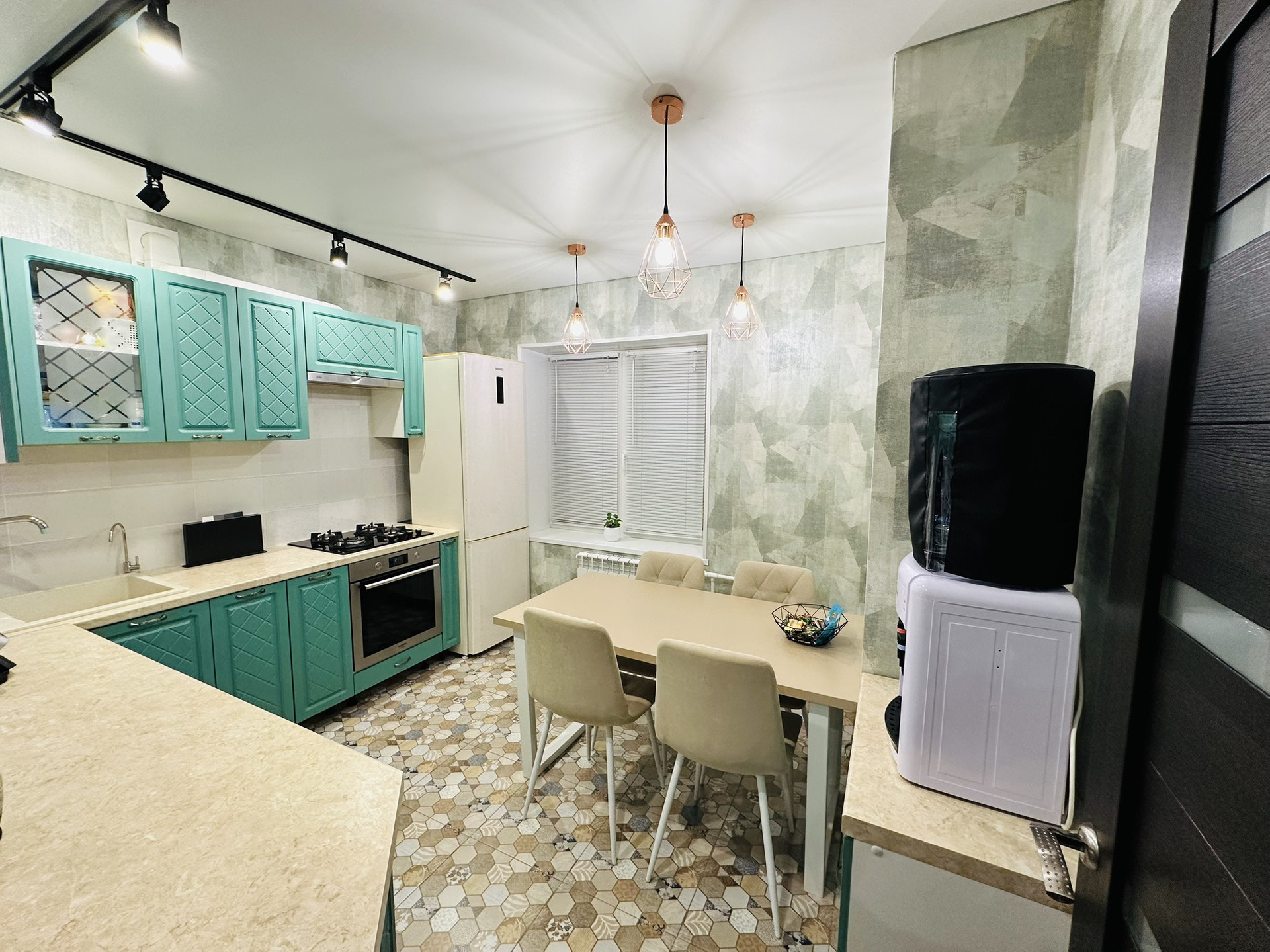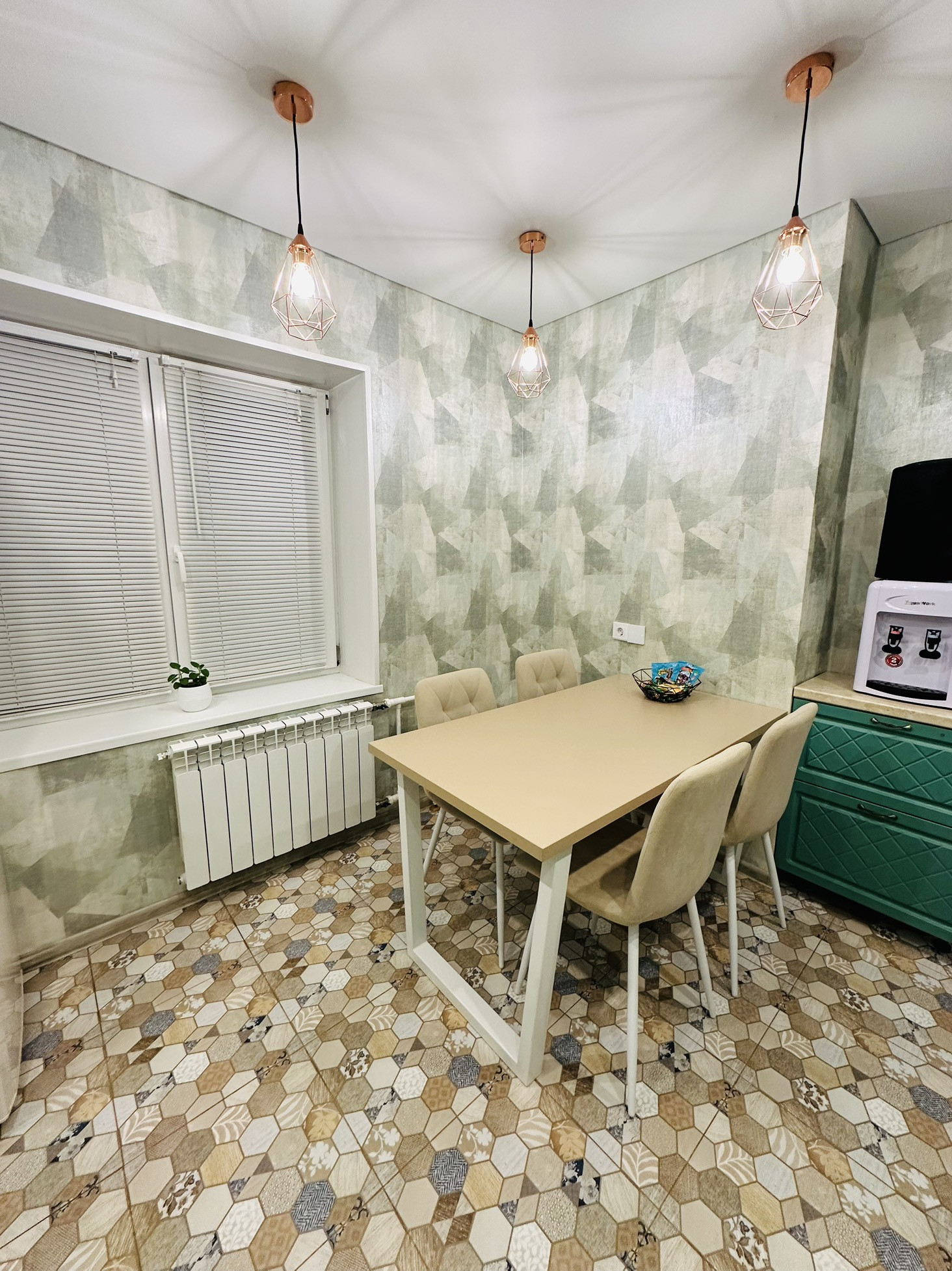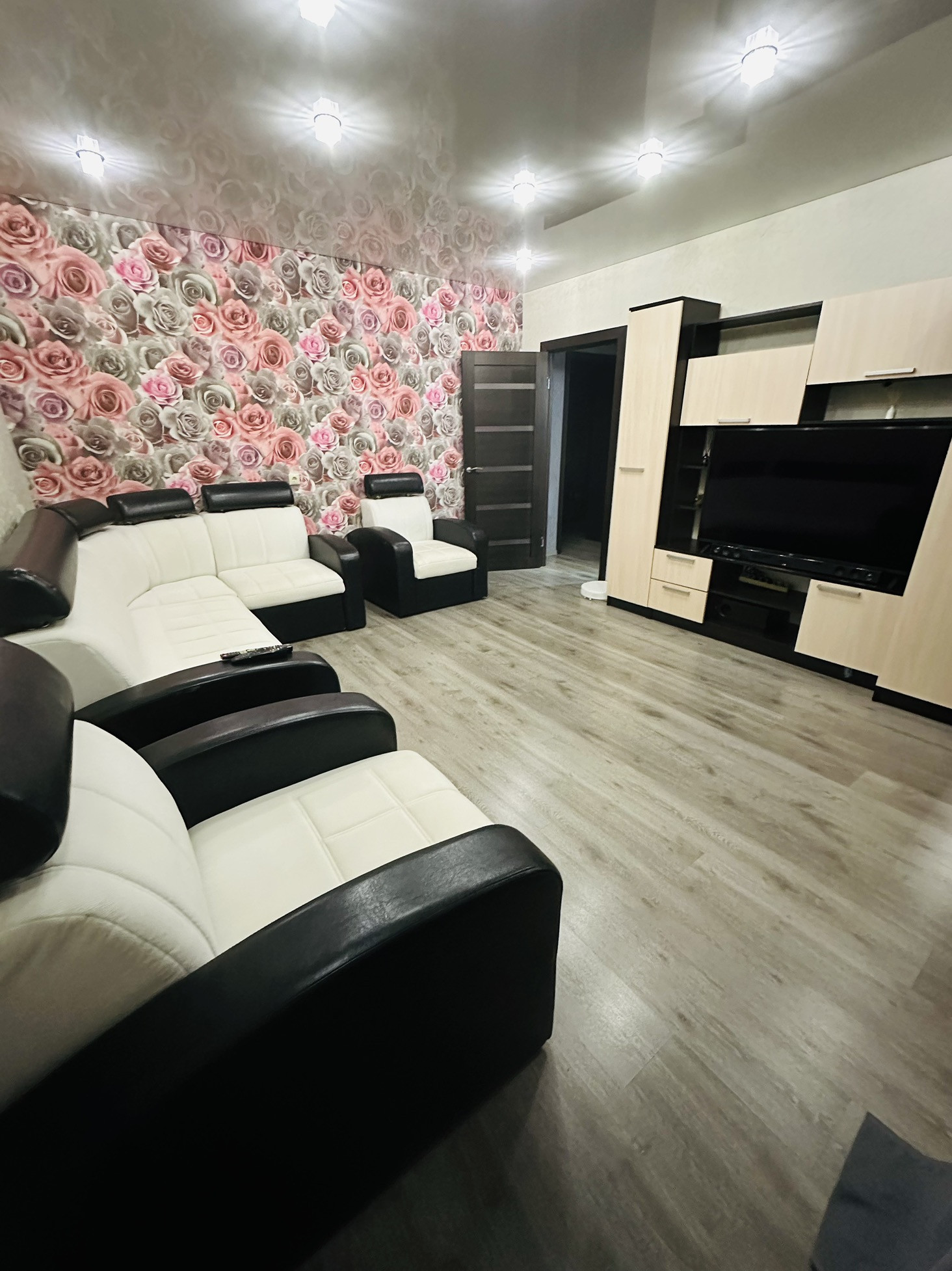 Перед поклейкой обоев были выровнены стены.Напольное покрытие в комнатах и на балконе ламинат 33 класса ,на кухне,в ванной и санузле кафель.Кухня оснащена теплым полом.