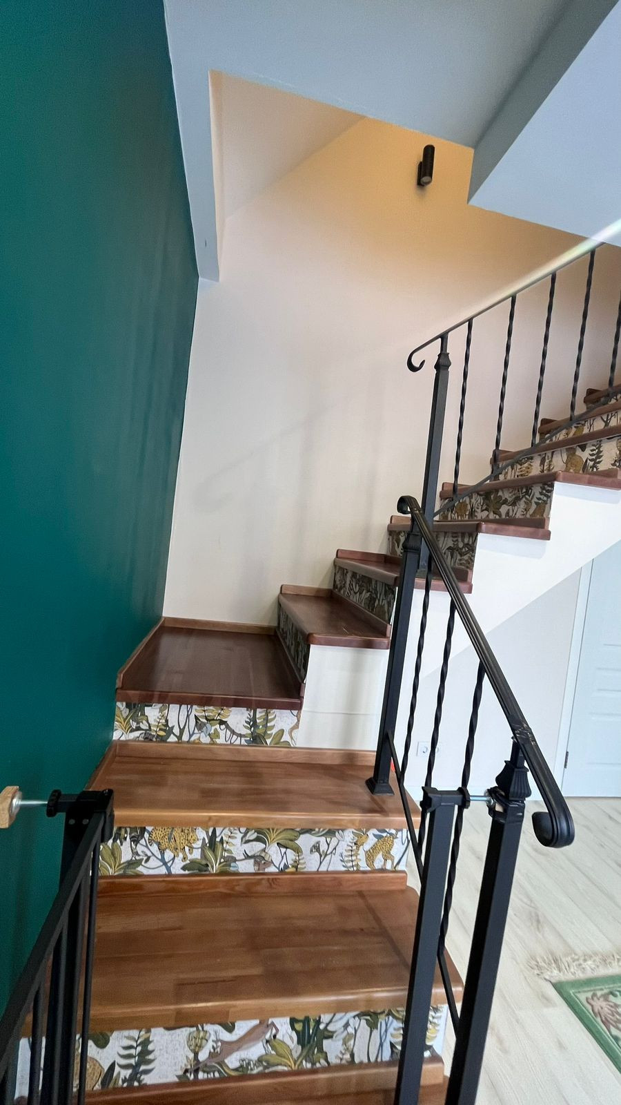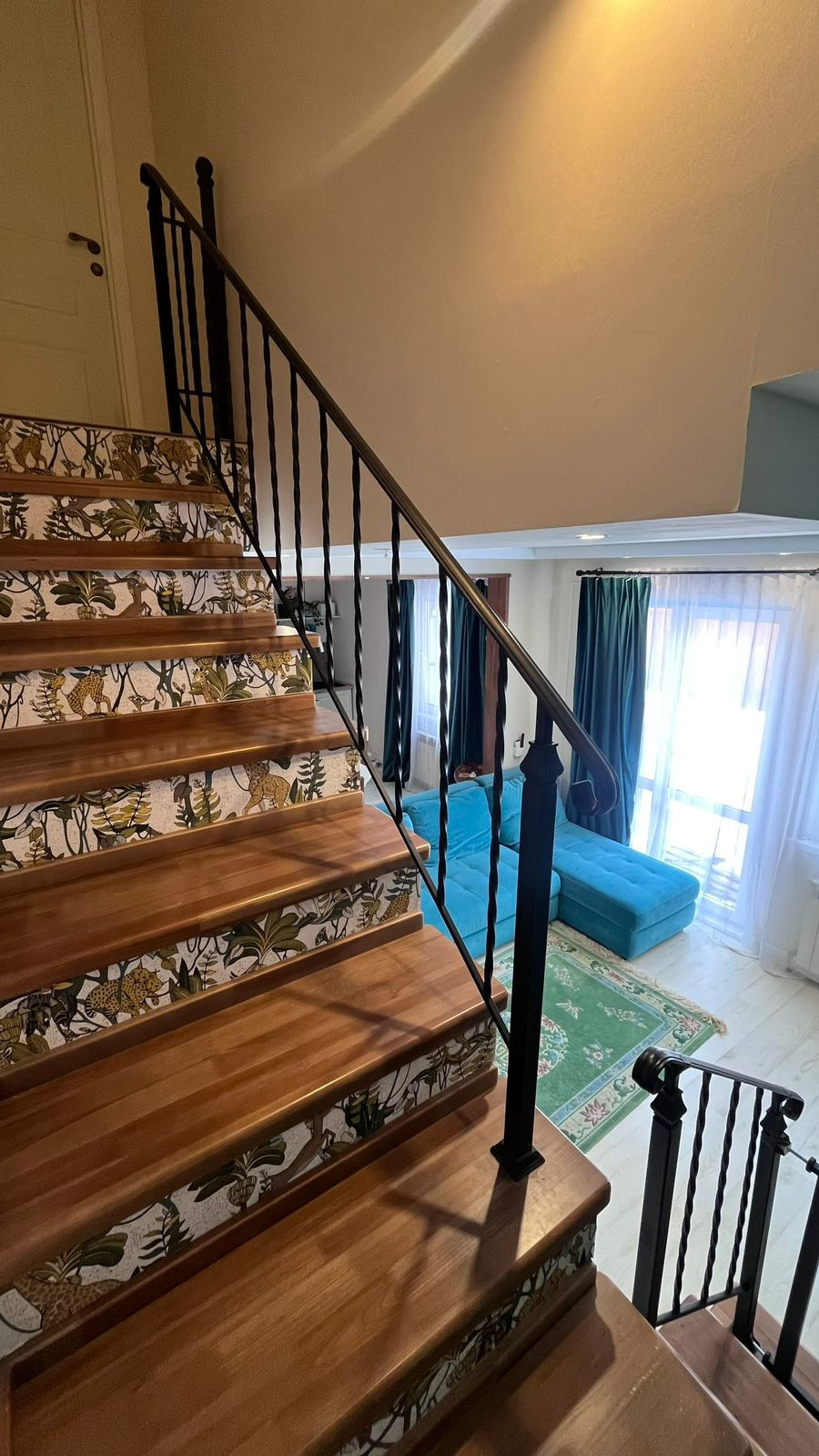 Лестница сделана из натурального дерева + итальянские кованные перила сделанные на заказ.