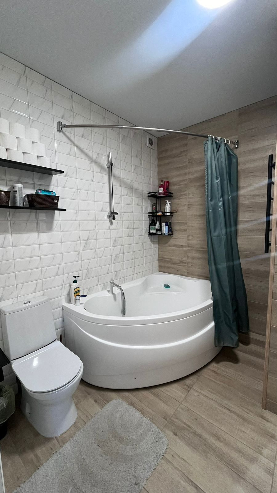 плитка - керамогранит, качественная сантехника, большая ванная, полотенцесушитель, место под стиральную машинку.