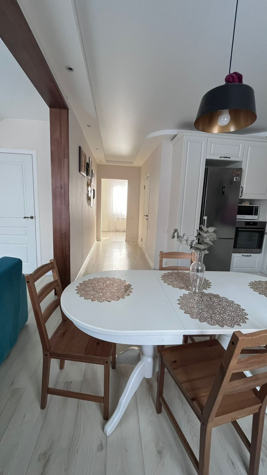 В гостиной остается большой г-образный диван, который может играть роль спального места для гостей в комнате есть искусственный камин. Можно купить электрический камин. Мы просто украшали его связкой настоящих дров для уюта)