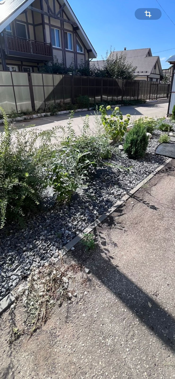 Перед домом полисадник отсыпан декоративными камнями, посажены растения. Есть парковочное место под 2 автомобиля.