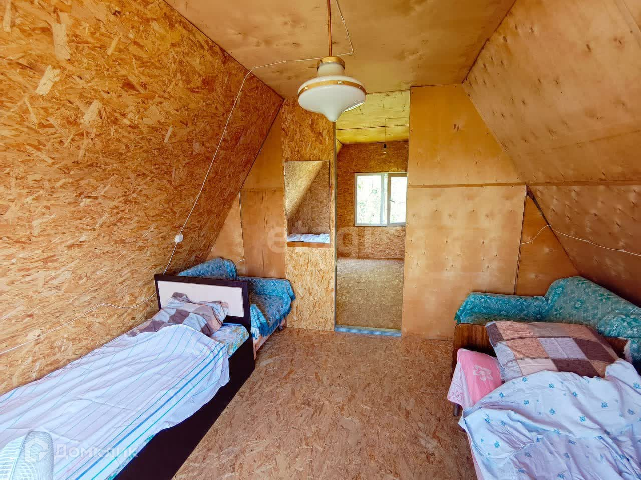 Отлично подойдет для семьи с двумя детьми - большой двухспальный диван на первом этаже и две кровати - на втором. Душ и туалет во дворе. Можно сделать водоснабжение и слив в доме.
