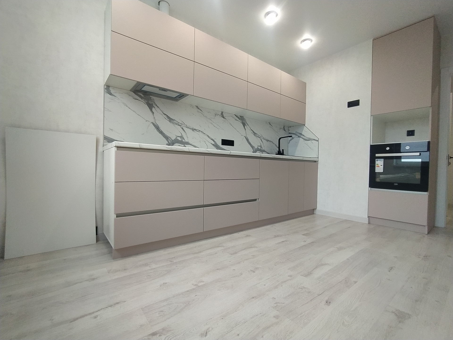 Просторная кухня . Установлен кухонный гарнитур со встраиваемой техникой ВЕКО,установлена дополнительная подсветка на потолке.