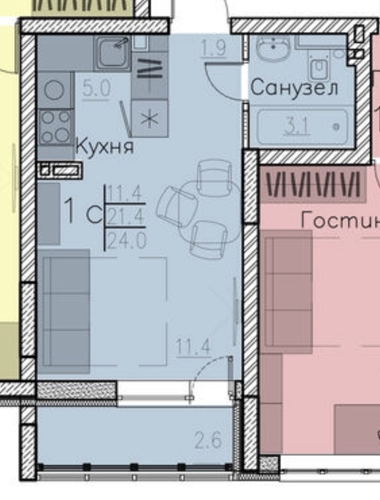 Общая площадь 24 м2
