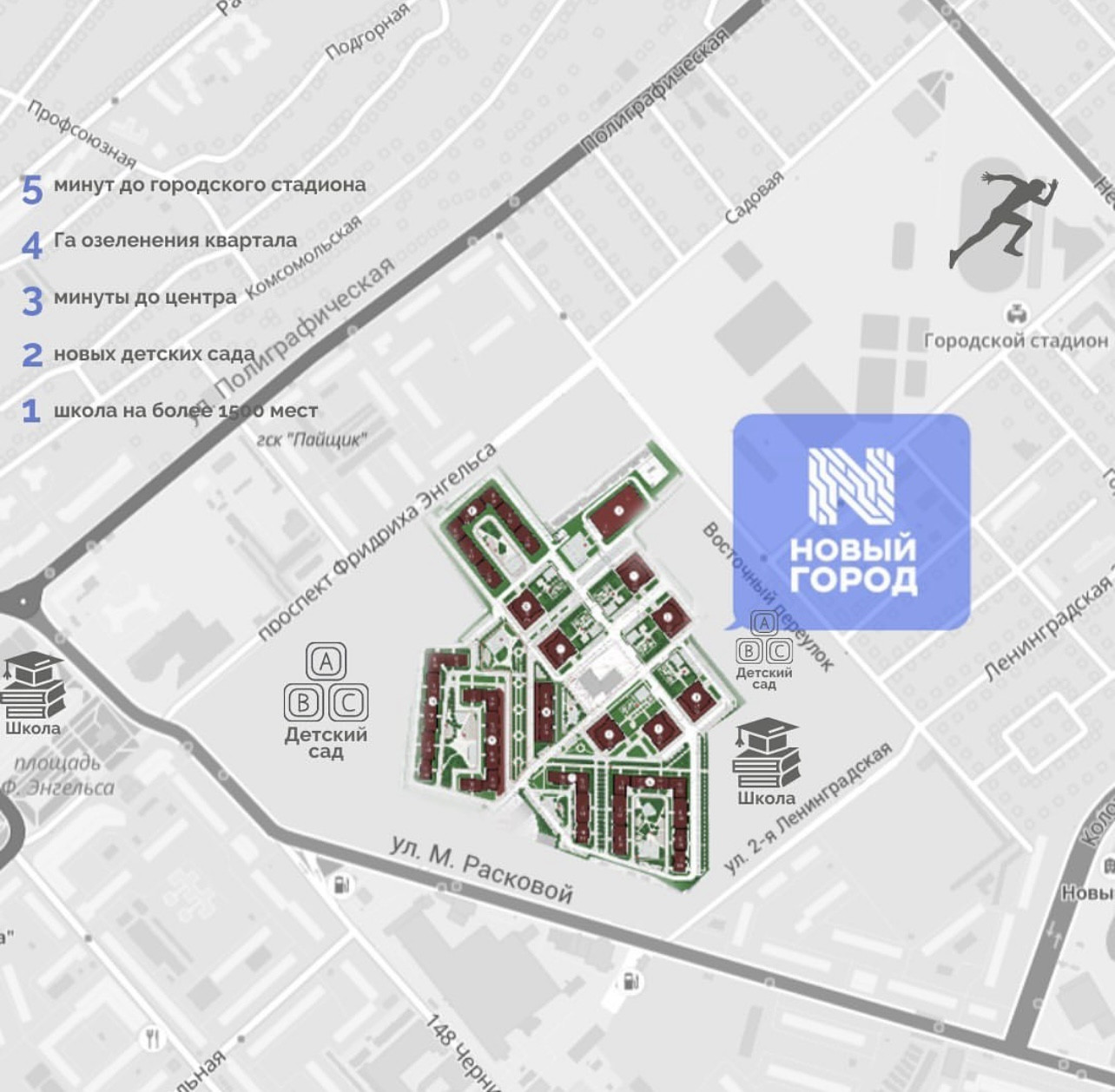 Концепция застройки "город в городе" – здесь есть всё для полноценной жизни: современные и надежные дома, детские сады, Житель квартала может почувствовать себя жителем небольшого яркого, современного городка, где высоко ценятся безопасность, уют и комфорт — это всё возможно в Новом городе!