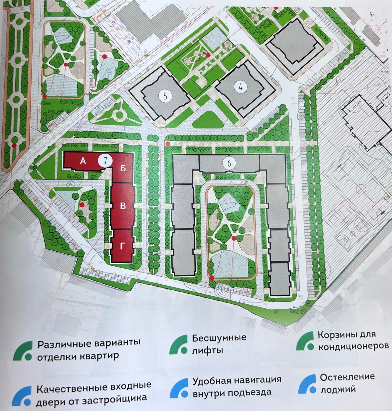 В комплексе планируются два детских садика, школа, взрослая и детская поликлиники, зеленые дворы-парки, бульвар, удобные многоуровневые и наземные парковки, спортивные и детские площадки.