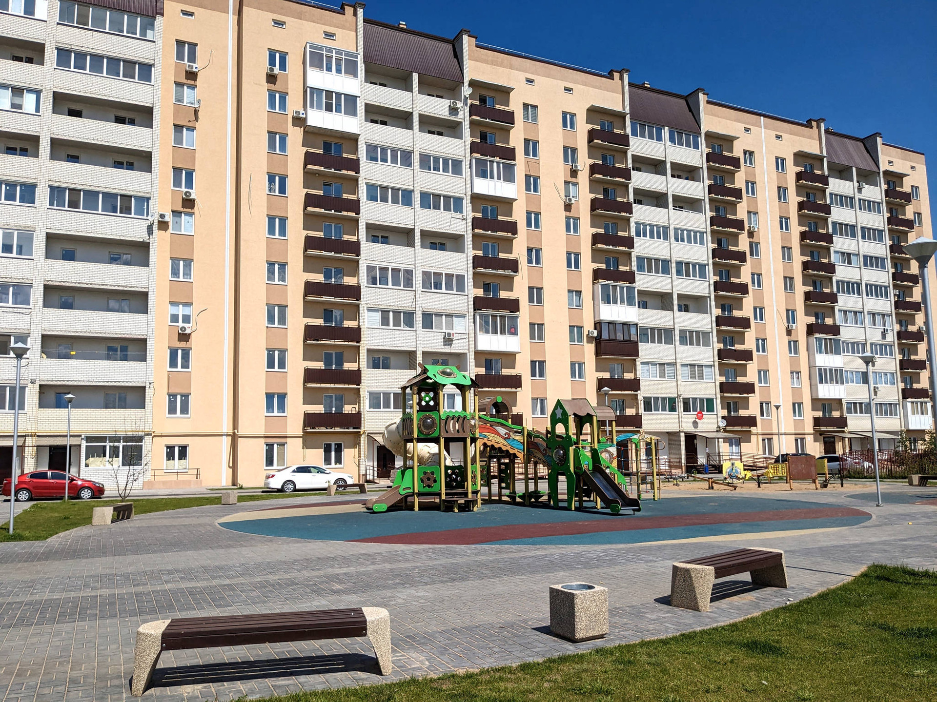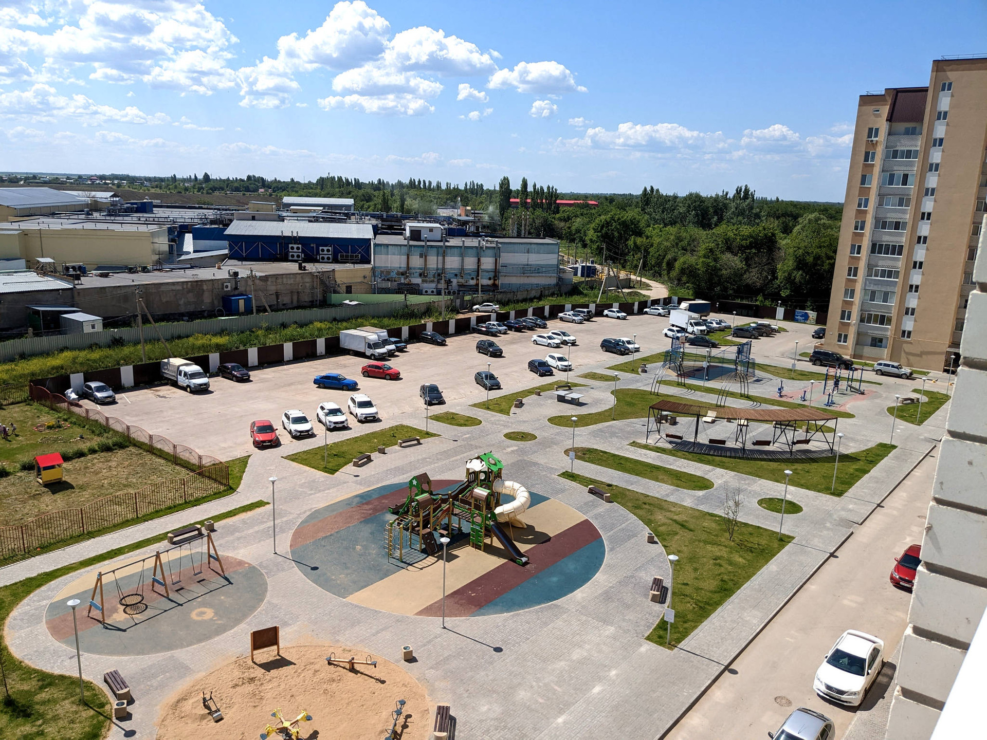 Современный оборудованный двор - детские и спортивные площадки, песочница, качели, большая парковка - много мест для автомобилей. Двор закрытый.