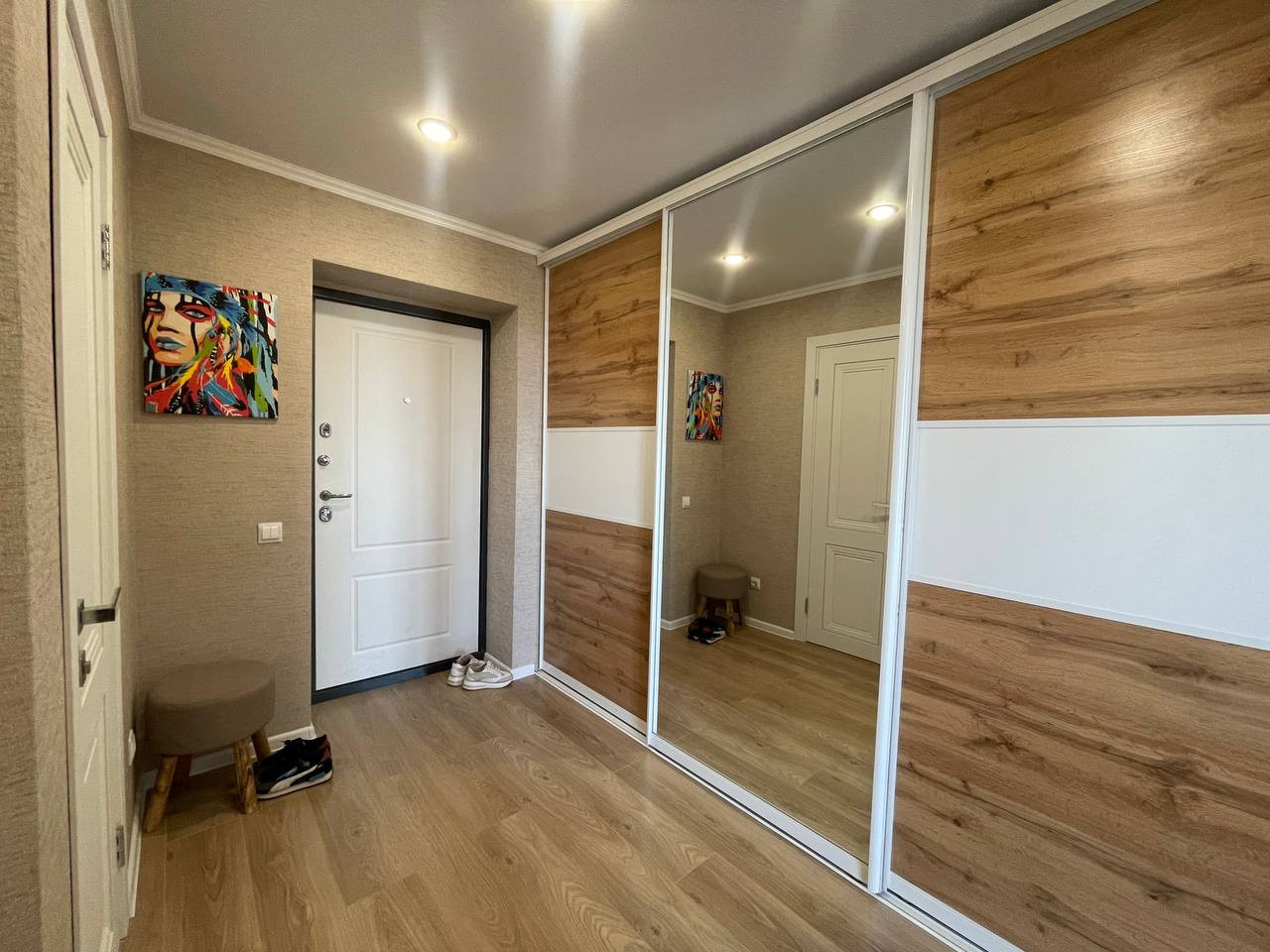 РЕМОНТ ( КОСМЕТИЧЕСКАЯ ЧАСТЬ)  обои подойдут под любой интерьер и любую мебель, рабочая стенка и с/у облицованы кафелем современного образца. натяжные потолки. на полу ламинат. установлены межкомнатные двери и входная металлическая дверь.