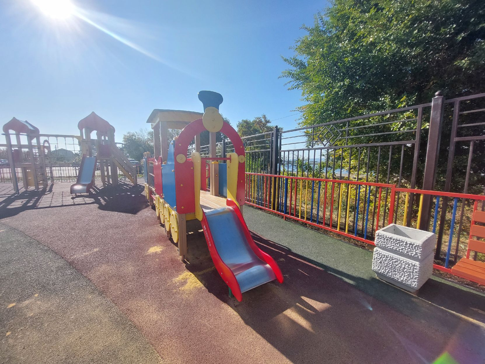 Из окна открывается шикарный вид на Волгу. Жилой комплекс располагается в тихом районе г. Энгельса, прямо на берегу набережной. Со двора дома есть свой выход к Волге, несколько видов современных детских площадок, оборудованная спортивная баскетбольная площадка, место отдыха для взрослых, магазины на первых этажах.