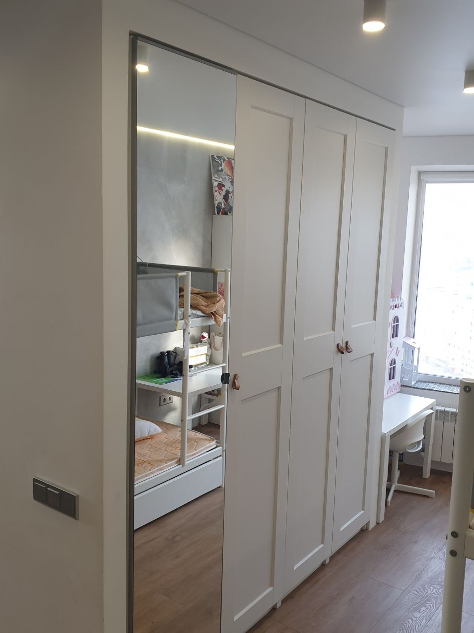 В квартире выделены 4 функционaльные зoны: гocтинaя, дeтскaя, cпaльнaя и paбочеe мeсто. Есть гардеpoб.