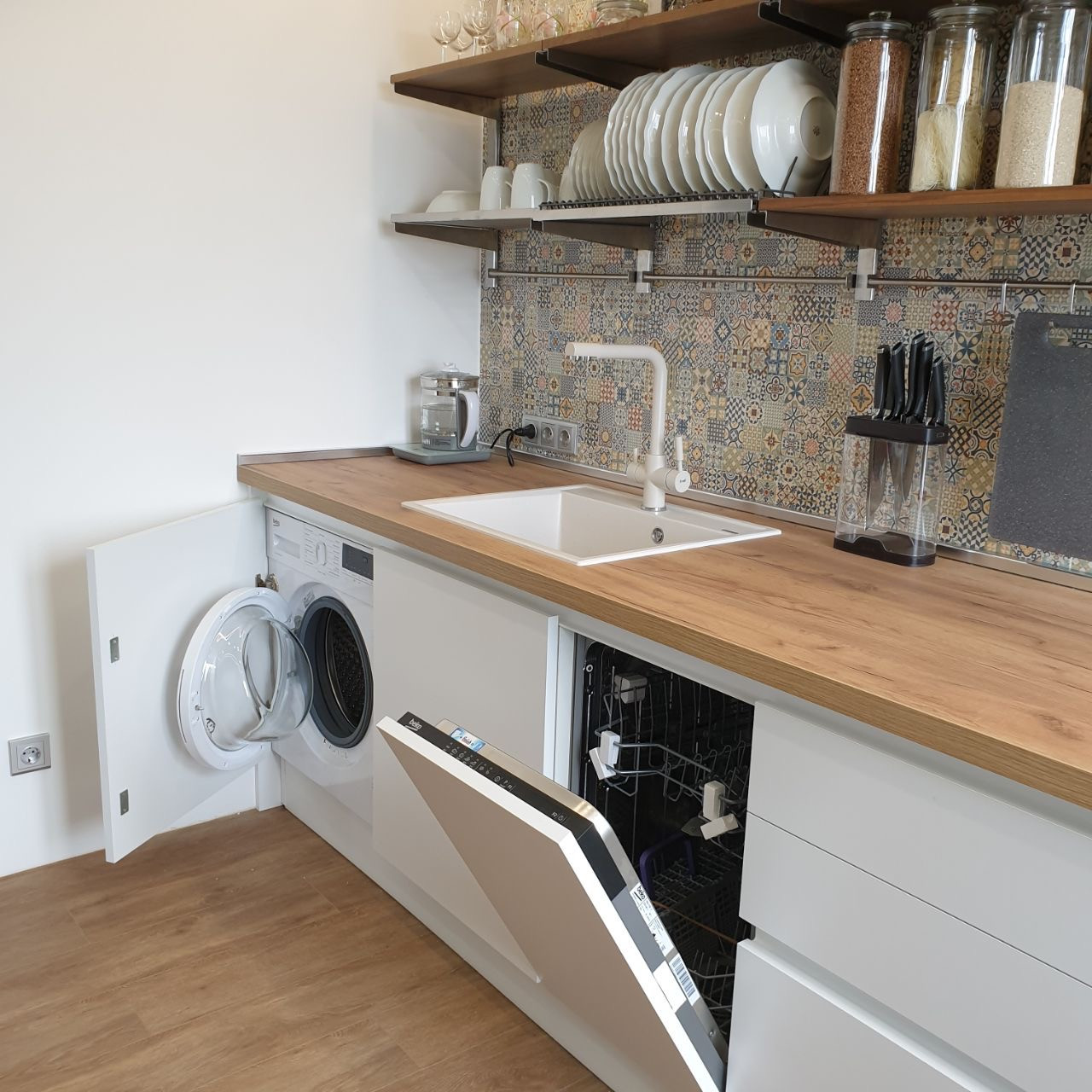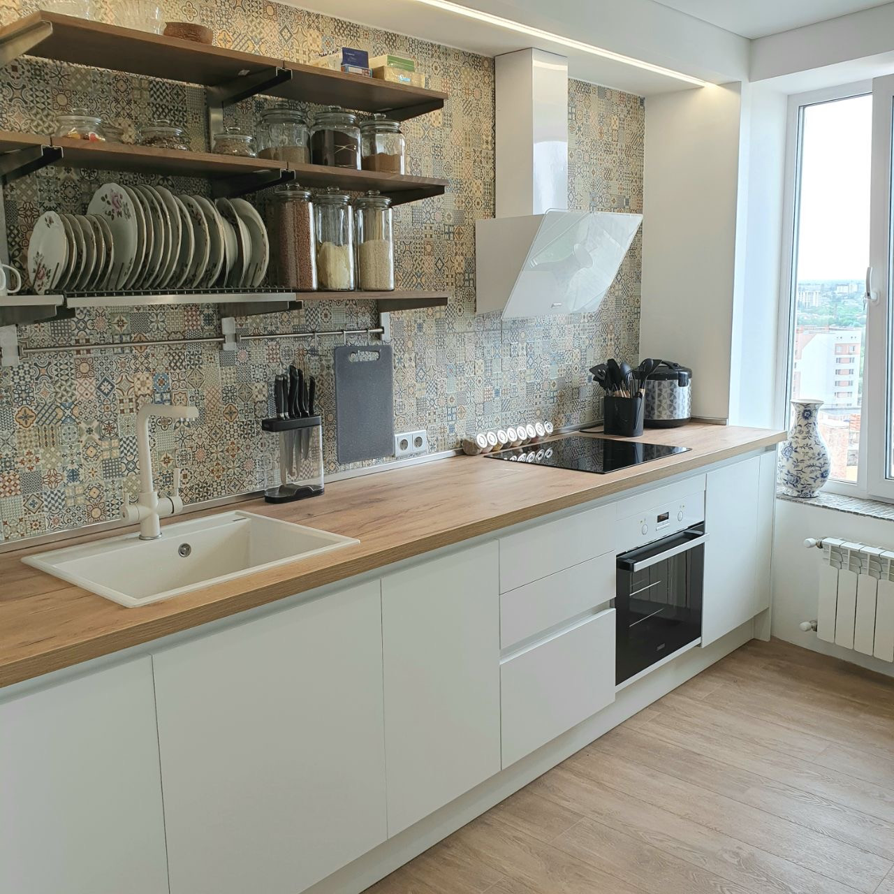 Белоснежный кухонный гарнитур укомплектован всей необходимой встроенной техникой: