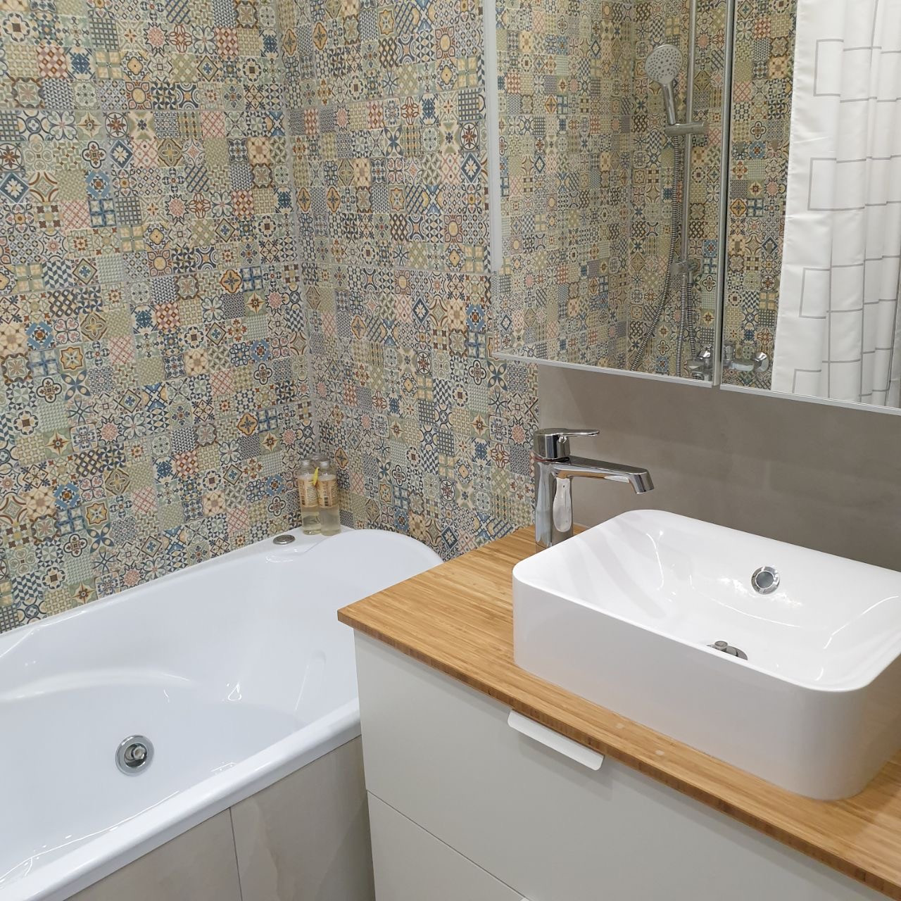 Для отделки ванной и туалета был использован керамогранит и декоративная штукатурка. Натяжной потолок имеет подсветку. Контурная подсветка имеется так же у зеркала умывальника. Выбирая тот или иной тип освещения можно создавать в ванной разную атмосферу. Ванная комната оборудована ванной с гидромассажем, а так же умывальником с накладной раковиной и встроенной тумбой с выдвижными ящиками. В туалете — унитаз на инсталляции, оборудованный гигиеническим душем. Здесь есть так же раковина со встроенной тумбой. Вся сантехника безупречного качества.